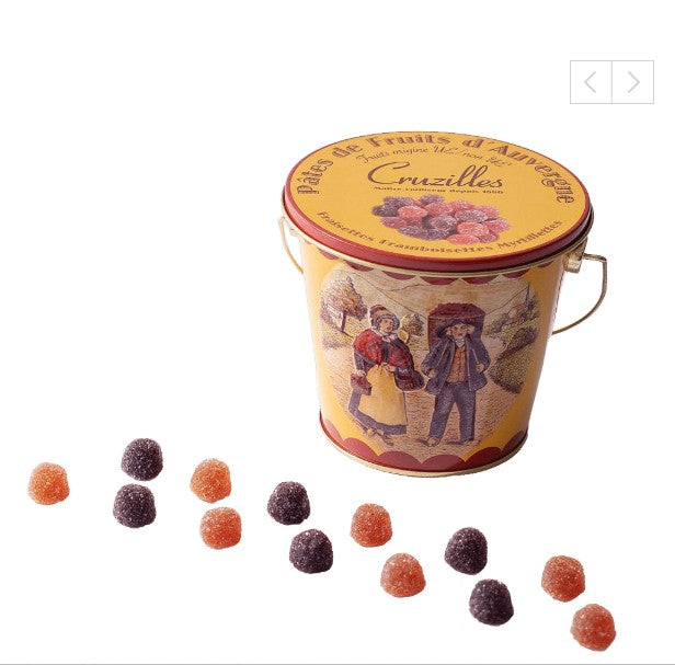 Maison Cruzilles, Pâtes de Fruits d’Auvergne French Fruit Jelly Candies in Metal Pail (Fraisettes, Framboisettes, Myrtillettes)