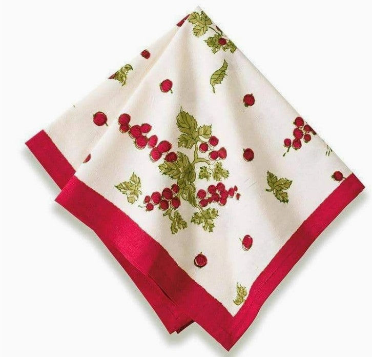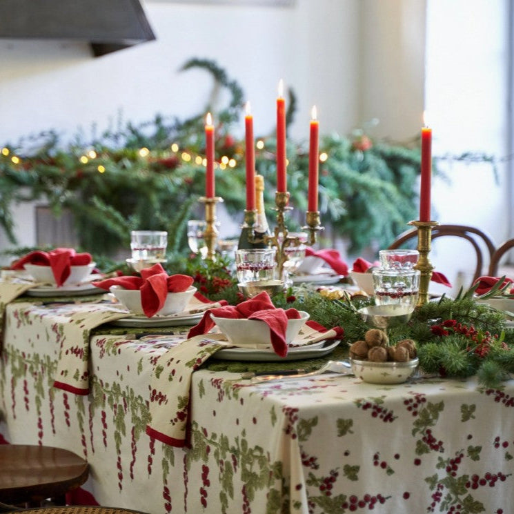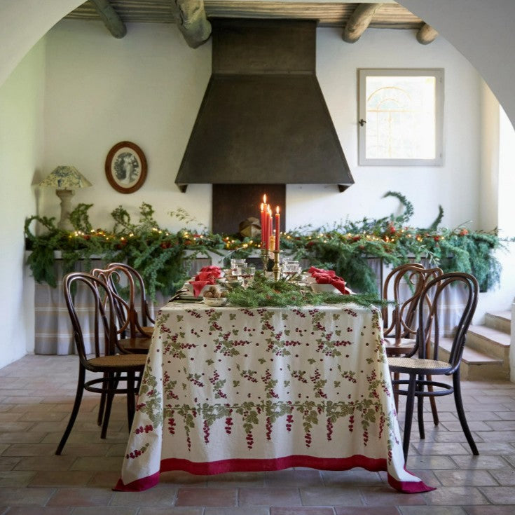With rich vermilion and mossy green designs set against a simply ivory background, the Gooseberry Tablecloth makes a fittingly cozy backdrop for a meal, whether a wintertime feast or a simple gathering any time of the year. This elegantly simple pattern adds a bit of understated beauty to your table setting.
