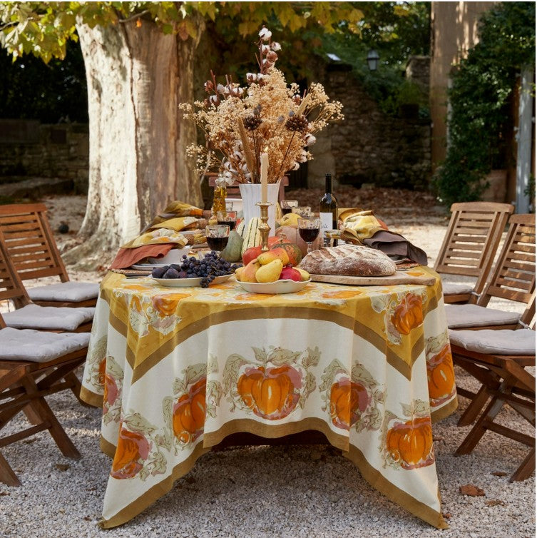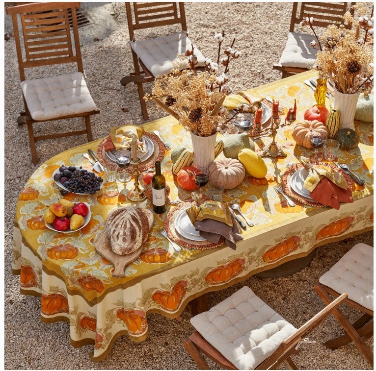With rich autumnal colors and vibrant pumpkin imagery, this finely crafted tablecloth adds a sense of seasonal delight to the table, ideal for entertaining guests during the fall months and beyond.