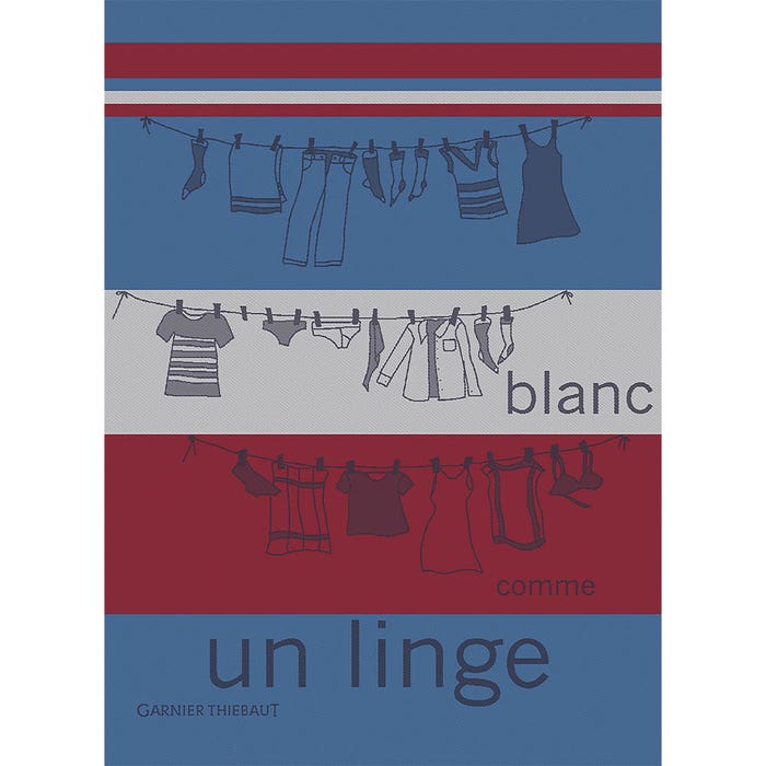 Featuring a timeless "tricolore"  - red, white, and blue design, beautifully illustrating clothing hanging on a clothesline, it captures the essence of simple, everyday elegance.
