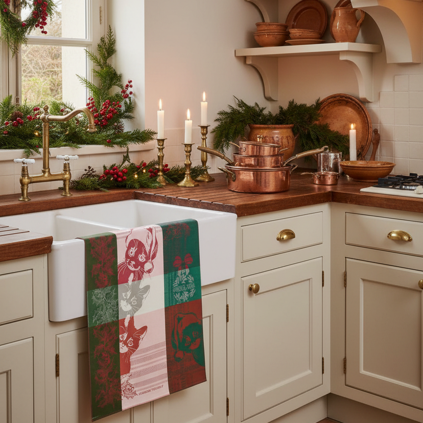 Garnier-Thiebaut, Chats de Noël (Christmas Cats), Rouge Jacquard Kitchen / Tea Towel