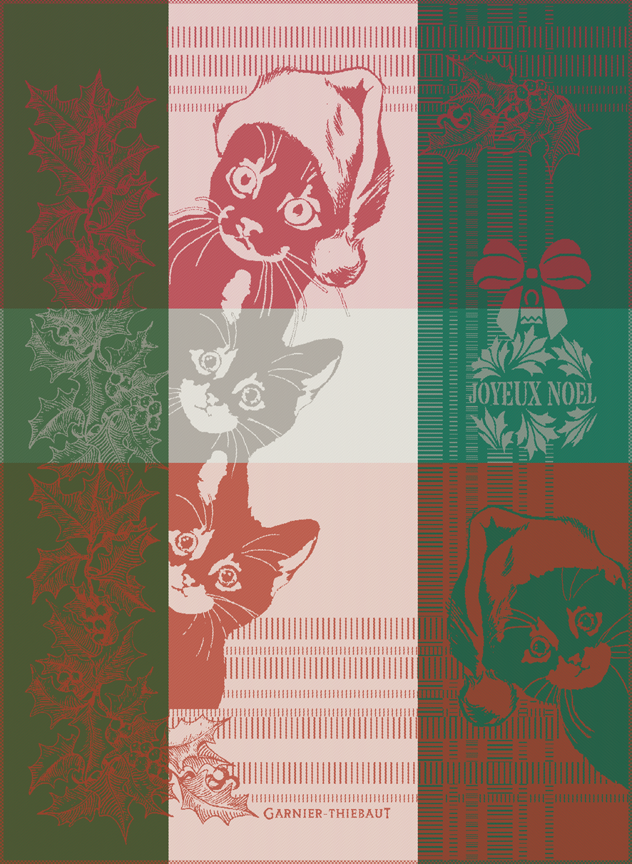 Not just children await the arrival of Santa! This charming Garnier-Thiebaut Christmas jacquard towel in holiday red and green has woven images of 4 little cats peering around a door with their Santa hats on, anxiously waiting the arrival of Pere Noël down the chimney!