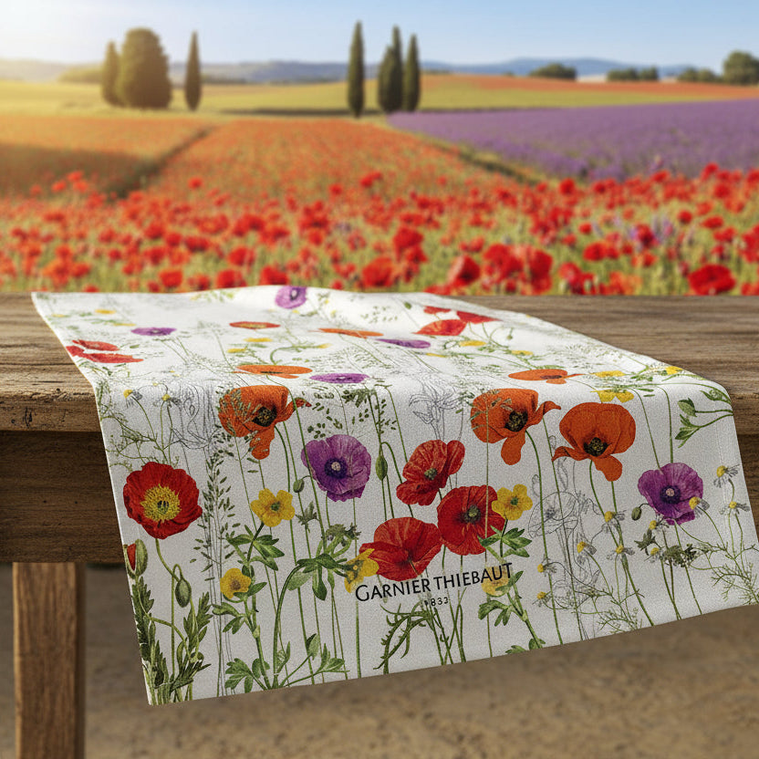 A beautiful towel featuring a classic French floral "Poppies" pattern accented with vibrant purple and red poppies on a soft white background. While lovely all year 'round, especially lovely in spring and summer months.