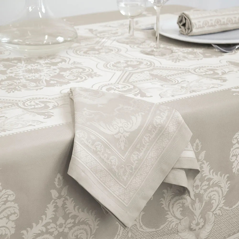 This Garnier-Thiebaut table runner showcases the hallmark elegance of French design through its Fontainebleau pattern, adorned with refined Renaissance-inspired motifs. The sophisticated champagne tone provides understated luxury that transitions seamlessly across seasons and interior styles.