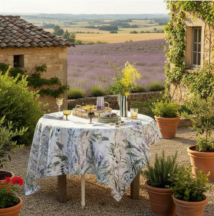 The fragrance of lavender and the beauty of florals and leaves dancing in the breeze are depicted in shades of white, green, and purple on the Parfum De Lavande Mauve table linens.