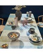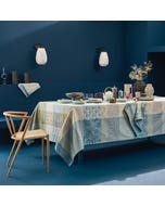 The Mille Zen Ecume Table Runner is woven in France from 100% extra-long staple cotton, featuring a smooth jacquard weave that offers both softness and lasting quality. Its floral and peacock feather-inspired madras pattern in tranquil shades of blue, grey, and cream is thoughtfully woven, with blended threads that create gentle movement and visual depth. Elegant and calming, this runner adds a serene touch to any table setting.