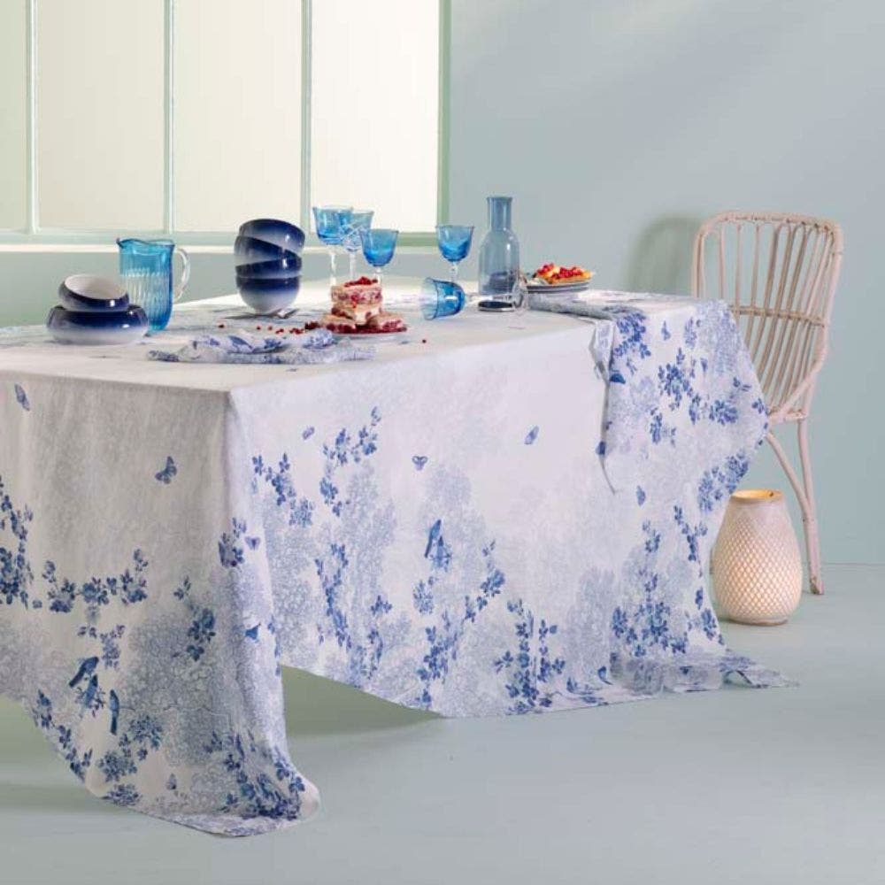 Inspired by a fine china pattern, this tablecloth is an "aviary" of blue-and-white butterflies and birds fluttering in the air. This fabric, composed of 100% pre-washed linen, has an elegant appearance lays nicely on the table with its effortless look.. Its lasting quality ensures years of luxurious styling to your dining area.