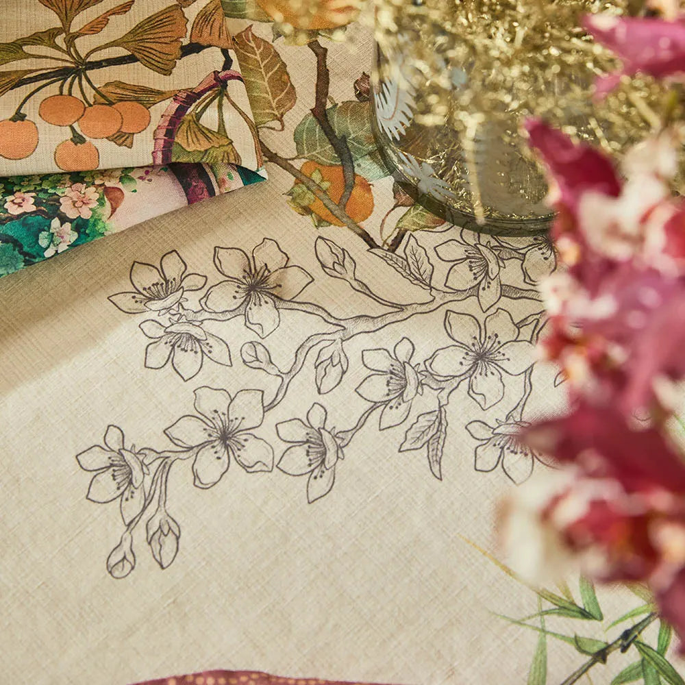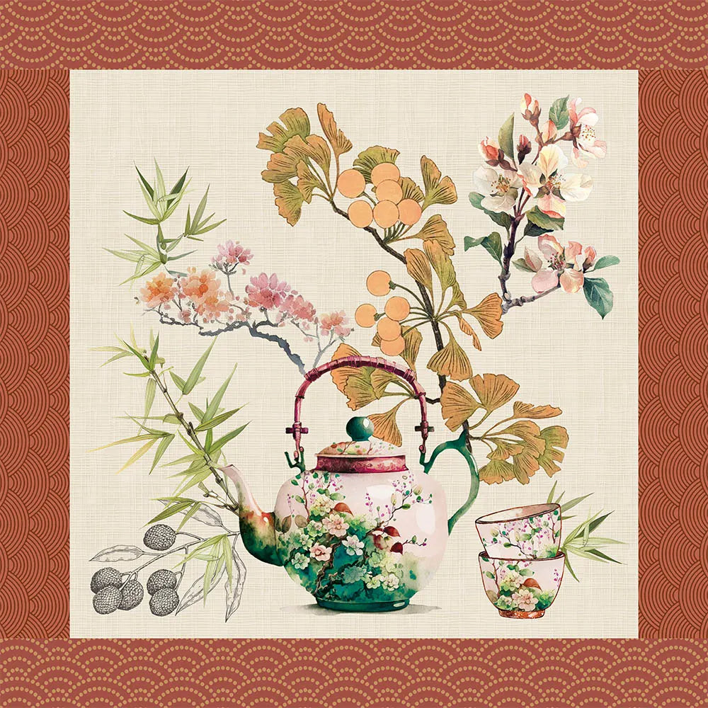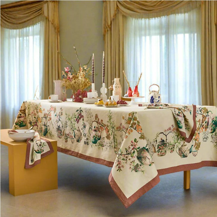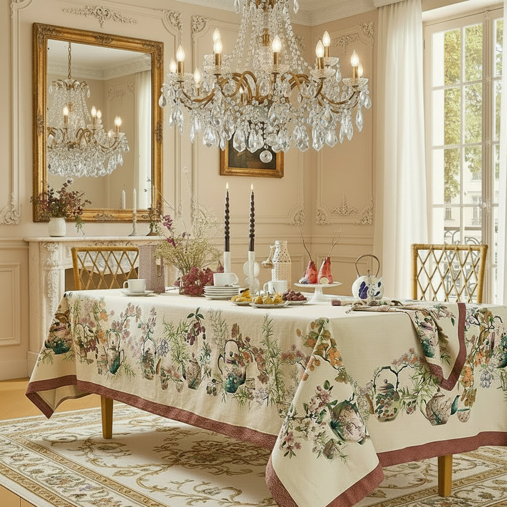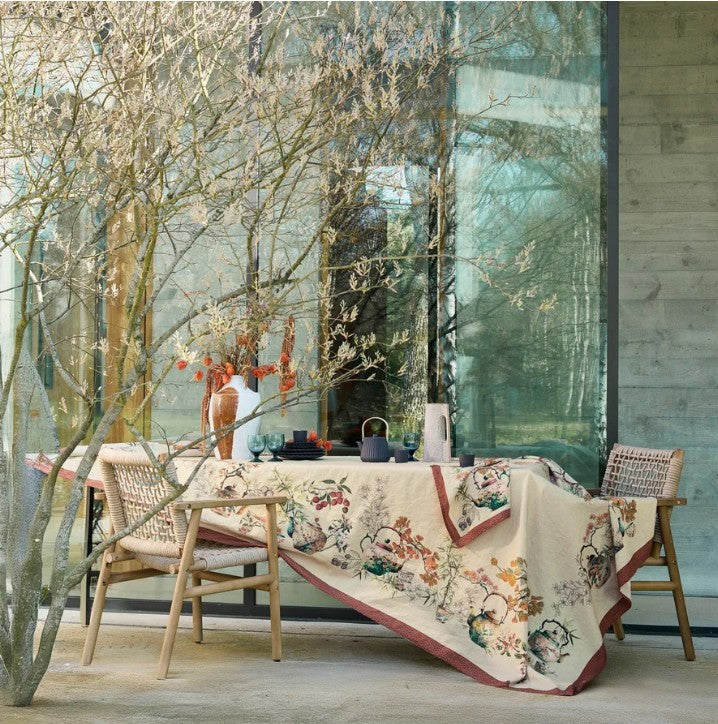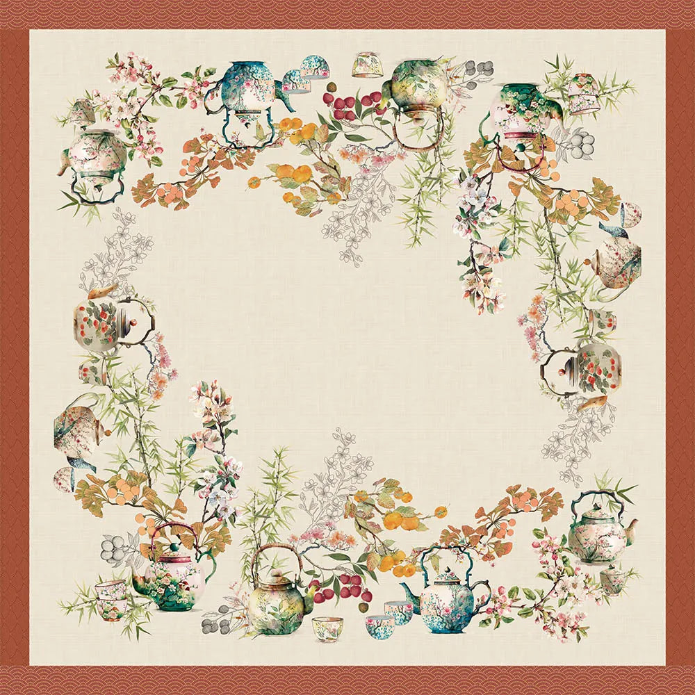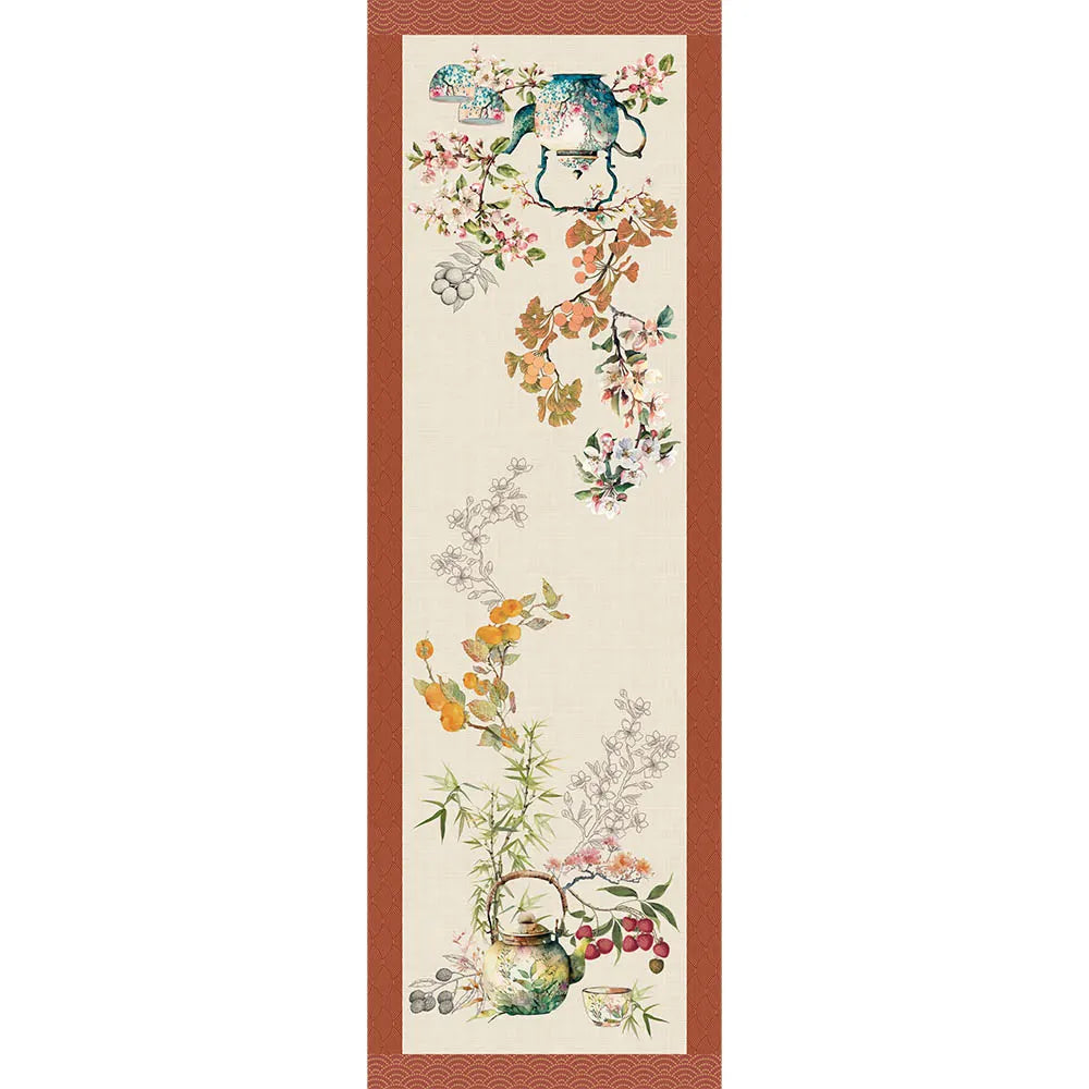 Created by skilled French artisans and inspired for traditional Japanese designs, this design features a printed border showcasing teapots and floral motifs in cream, orange, green, and blue hues, adding warmth and personality to your dining space. Elegant and adaptable, this runner enhances both daily dining and special occasions with understated charm.