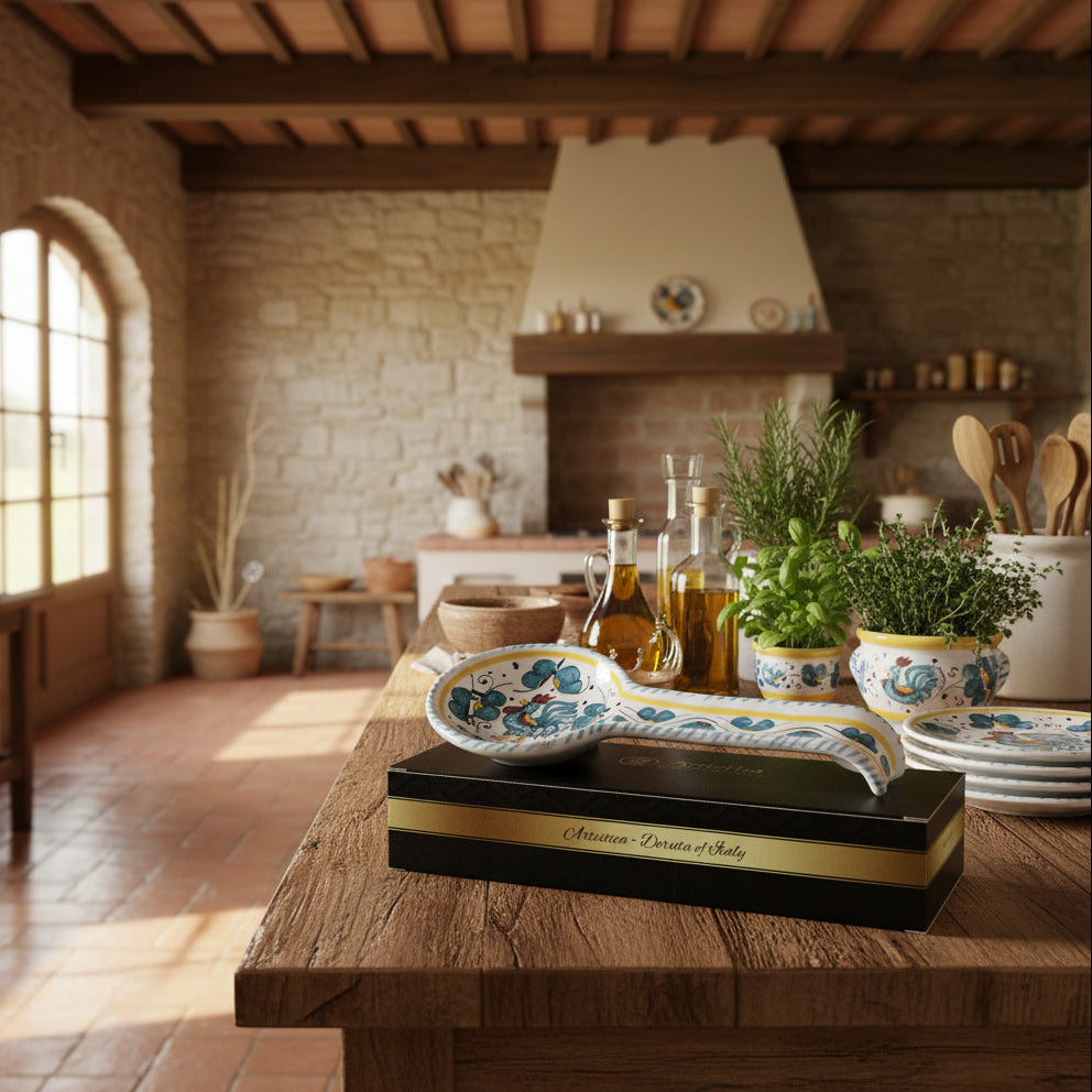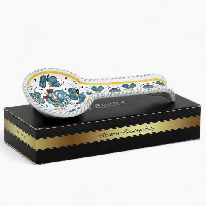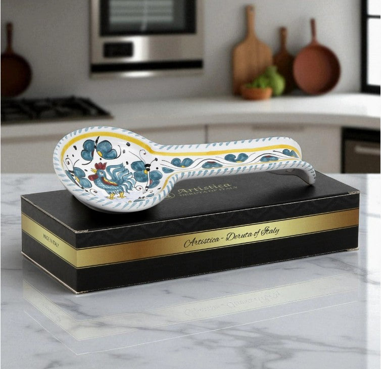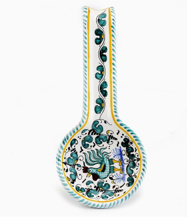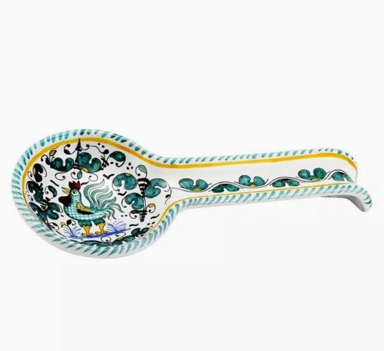 Authentic Deruta Italy Hand Painted Ceramic Spoon Rest, "Orvieto Green Rooster" in Gift Box, 11"