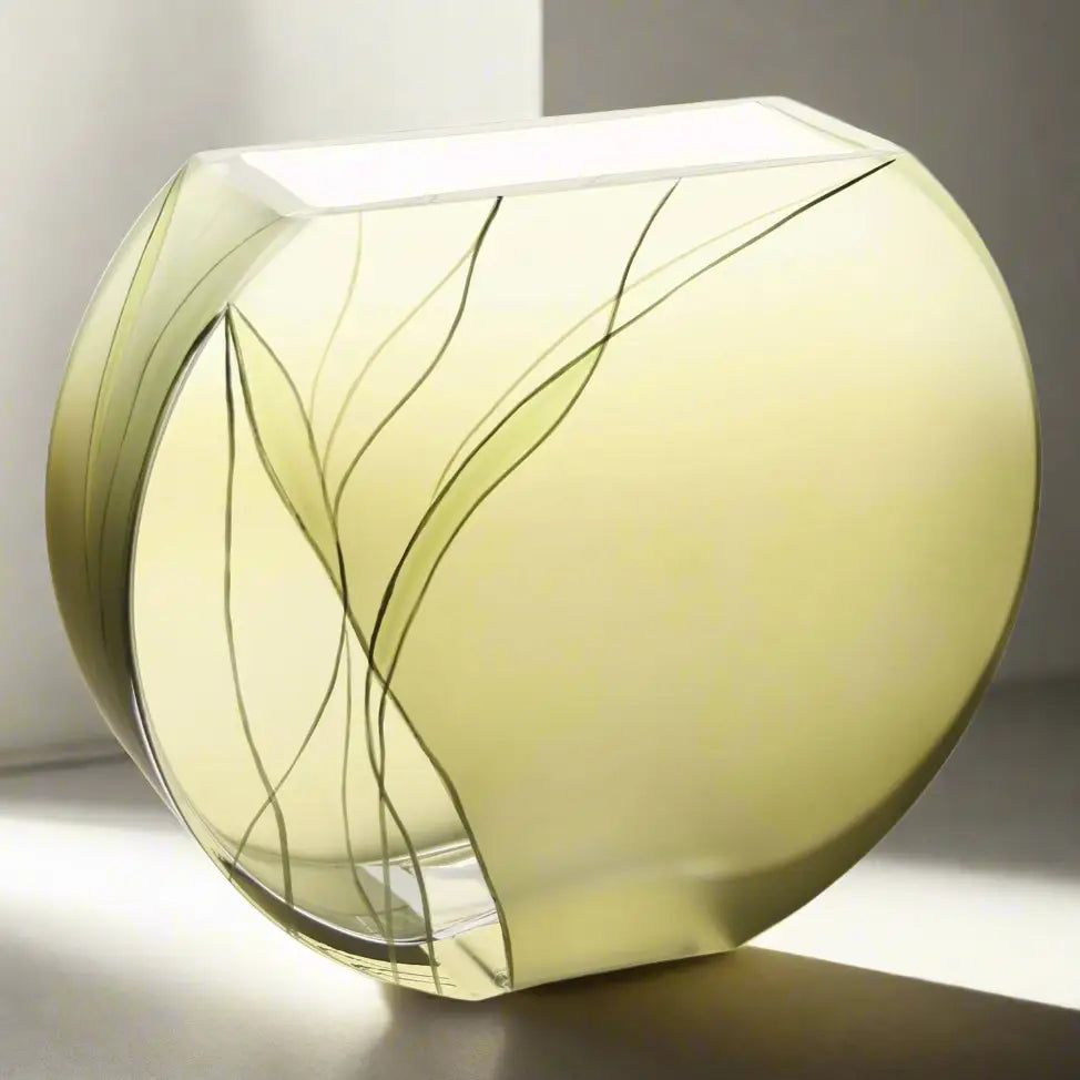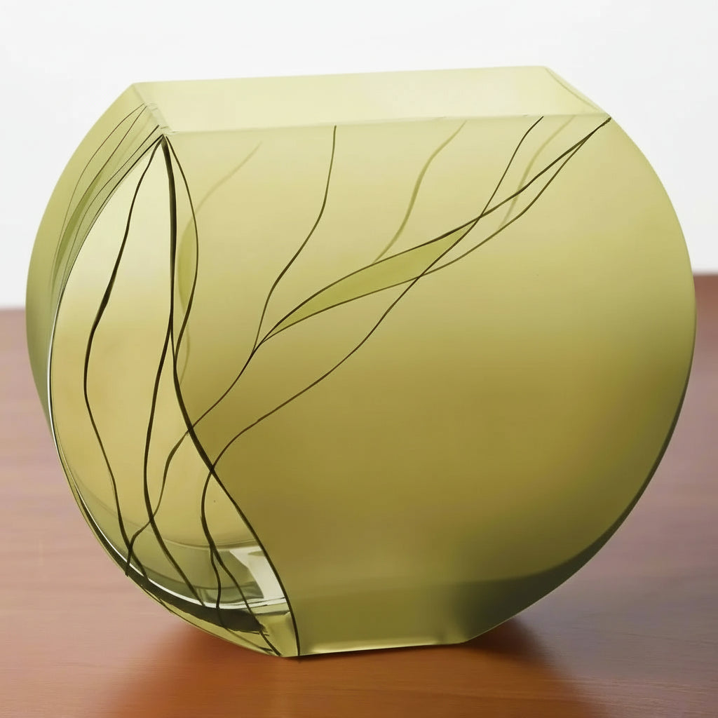 Evergreen 9 inch European Design Vase on this unique shape is a very appealing decor addition. Evergreen Design is a French-inspired Polish design created by blowing the highest quality clear glass then sandblasting parts of the design, followed by precision hand painting and baking. These vases are quite beautiful with or without flowers. This beauty makes a fabulous wedding, engagement or house warming gift.