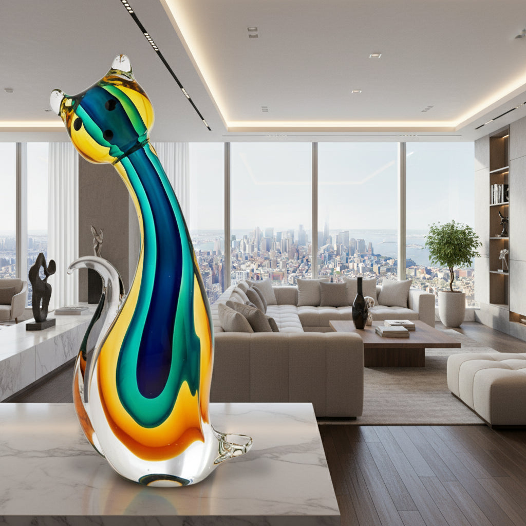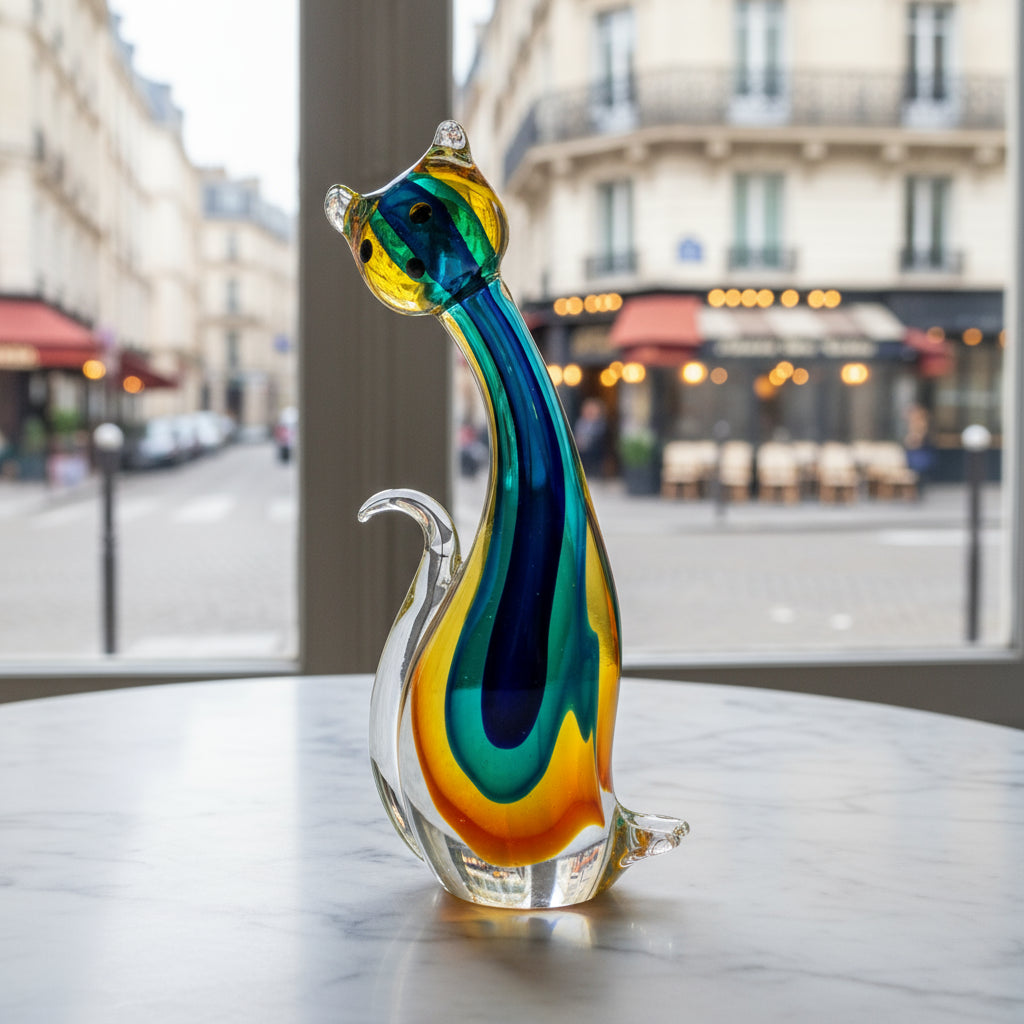 This stunning 11-inch crystal cat sculpture is expertly hand-blown in Europe, showcasing exquisite Murano-style craftsmanship. Its layered art glass design captures light beautifully, creating a captivating display piece that blends elegance with subtle charm.