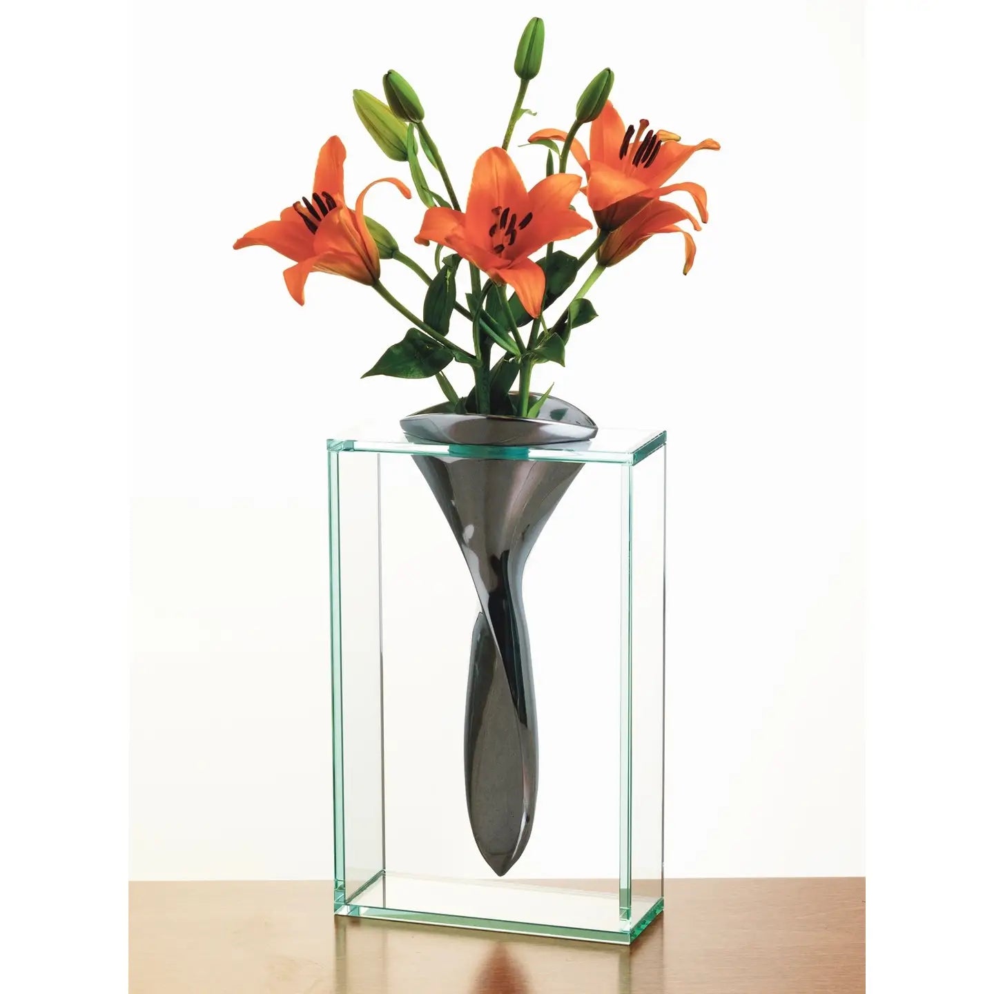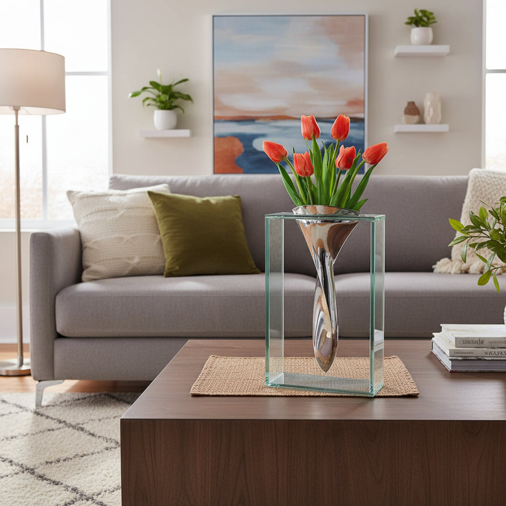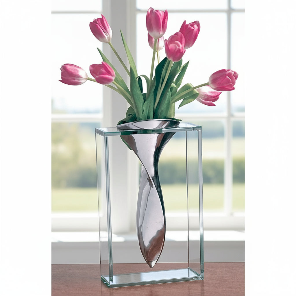 The Elvis Vase 13 inch - A Unique Blend of Non-Tarnish Aluminum and Glass. Do it! The Elvis Vase is a mover. 14" high by 8" wide - it's on! His non-tarnish aluminum body swivels right through the middle of that glass. Let him hold your flowers. Just like the King - AS14 is a legend. This vase is one solid piece and holds water.