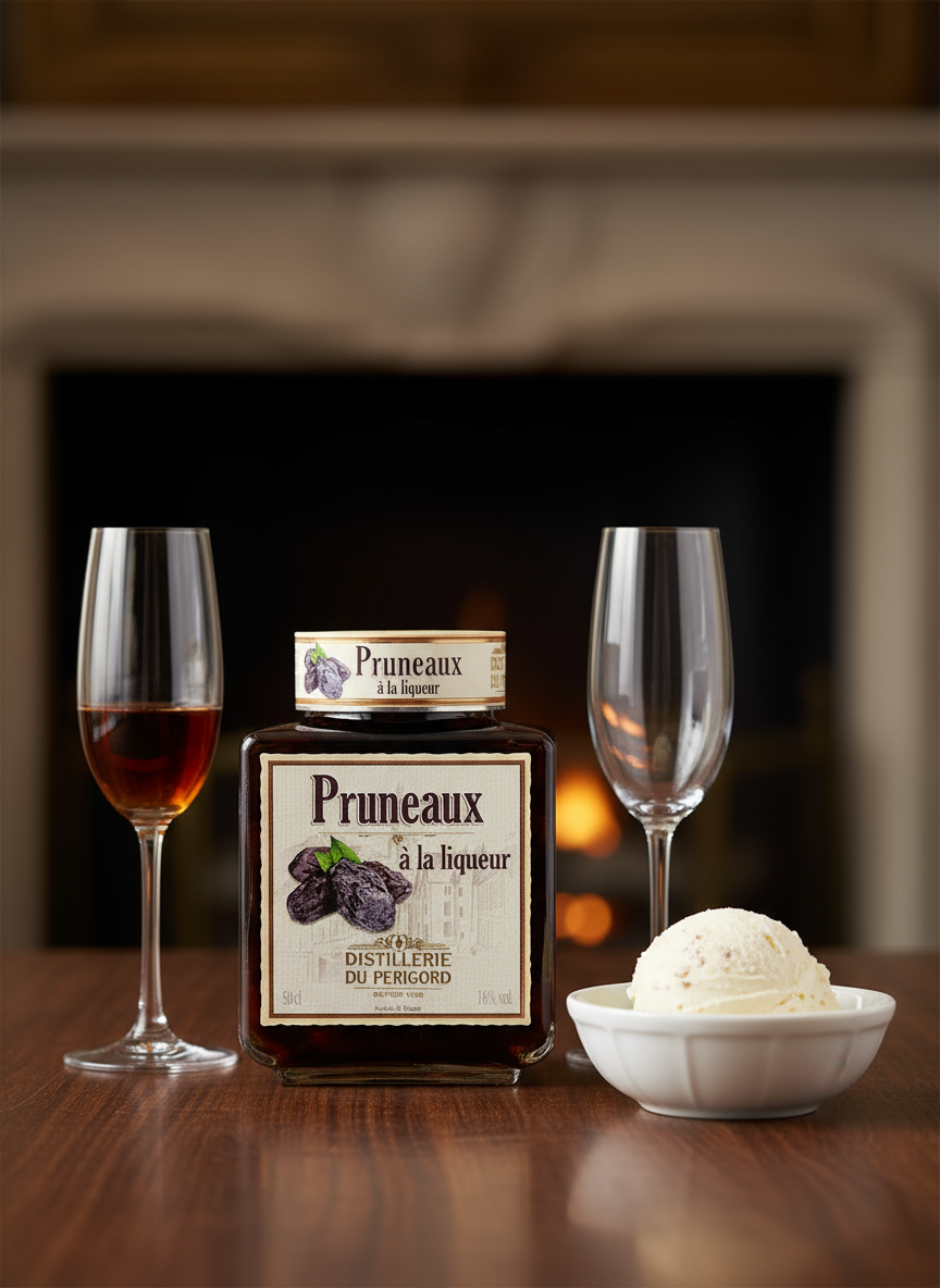 Prunes in liqueur should be indulged in after coffee, as is the custom, in the still-warm cup or, in a more original way, dotted around scoops of ice cream or sorbet.