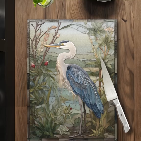 Elevate your culinary presentation with this gorgeous Blue Heron Tempered Glass Cutting / Serving Board. Its seamless fusion of functionality and artistry transforms everyday kitchen tasks into an exquisite experience. The high-quality tempered glass is resistant to stains and odors, ensuring it stays fresh and new indefinitely. This unique piece showcases the image while serving a practical purpose.