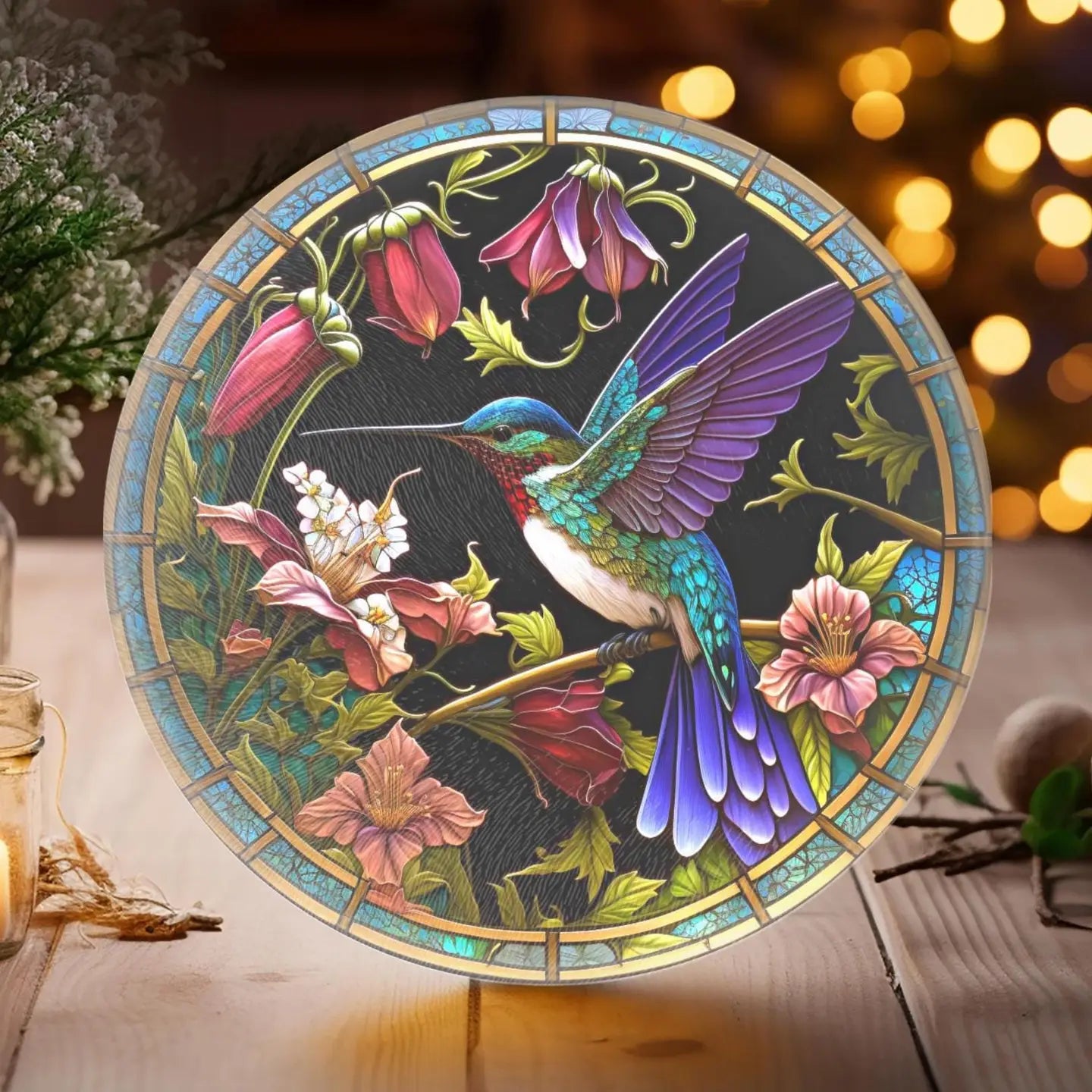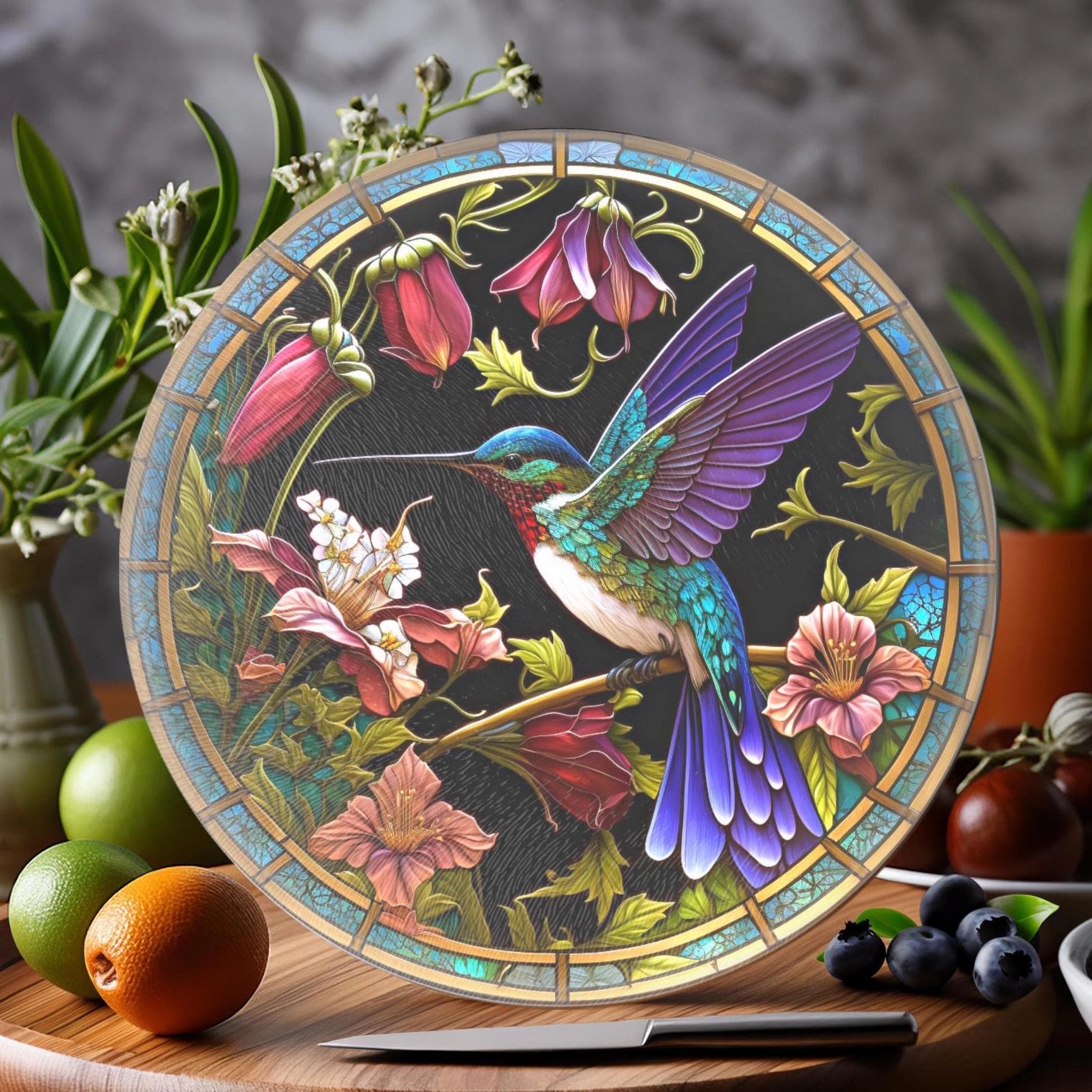 Fernville Creations, Hummingbird Tempered Glass Round Cutting / Charcuterie Board