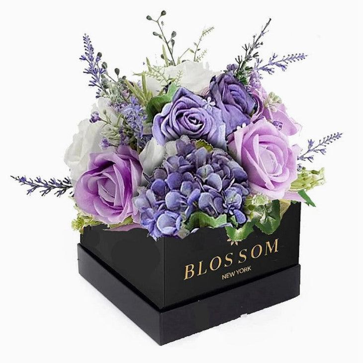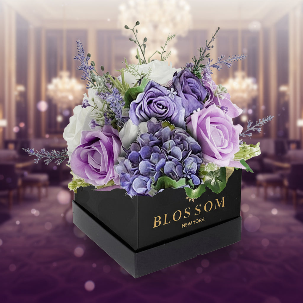Brighten your day with this exquisite purple floral bouquet. Featuring an artful mix of flowers in rich shades of purple, it brings a refined and graceful charm to any room. Presented in an elegant black gift box, carefully enclosed in a cello bag and finished with a satin ribbon, this arrangement is perfectly poised to impress as a thoughtful gift or a stunning decorative piece.
