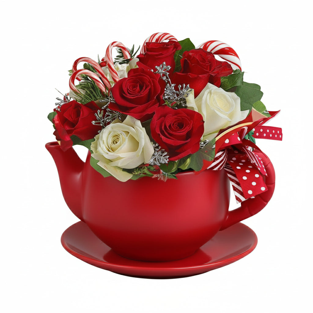 Forever Flowers, Holiday Roses in Red Teapot Floral Soap Arrangement
