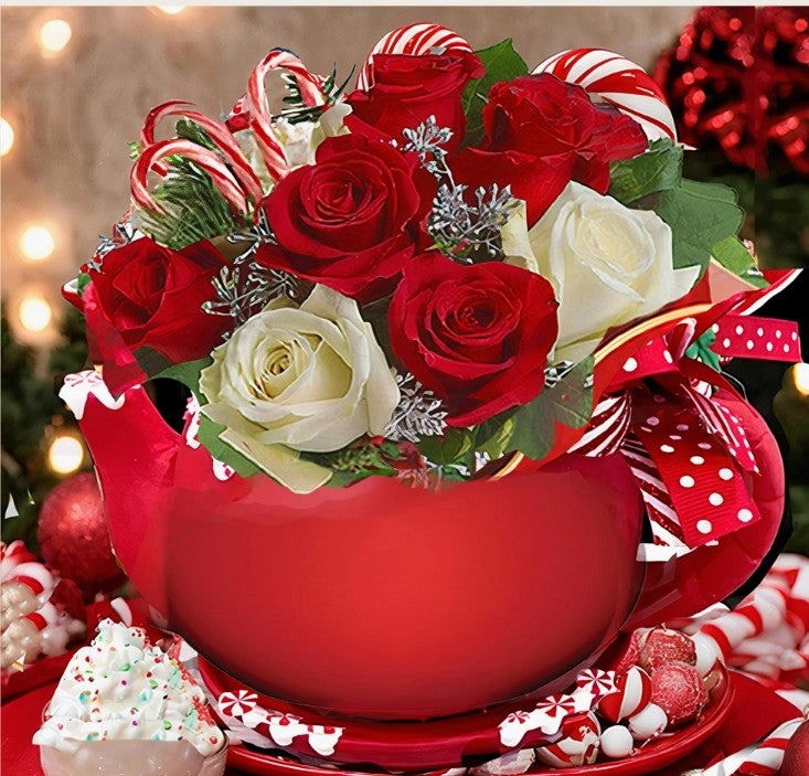 Each rose arrangement arrives perfectly arranged in a red ceramic teapot, snuggled inside a cello bag, and tied with a satin ribbon—ready to dazzle as a gift or a vibrant display.  A delightful arrangement of soap flowers that your loved one will cherish this holiday letting them know "you're special."