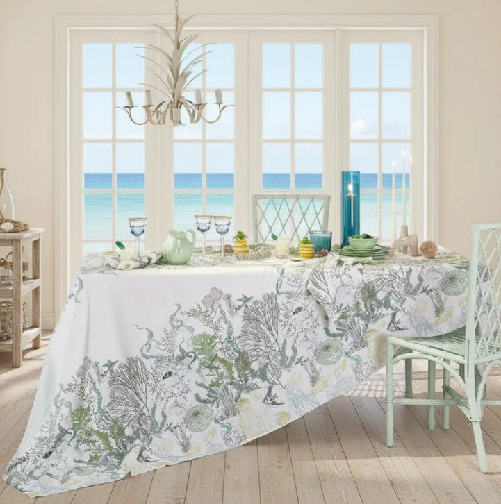 Tropical fish, coral, and seaweed float in water, brought to life in shades of white, green, blue, grey, and yellow on this lovely table runner.