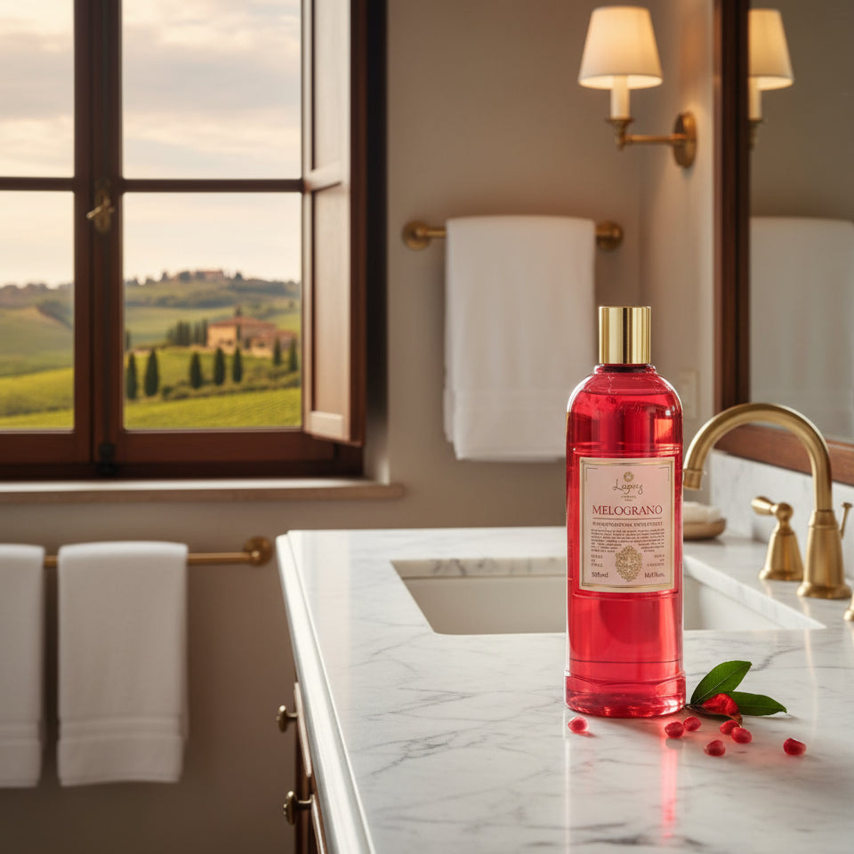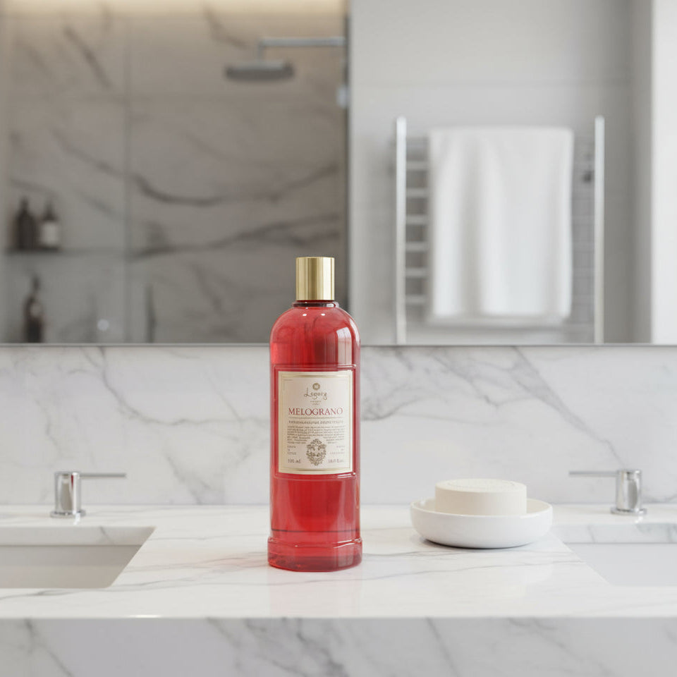 Scent - A luxurious fruity shower gel with pomegranate notes, offering a gentle cleanse and leaving hands nourished and subtly perfumed. The Melograno fragrance features notes of pomegranate, red fruits, coconut, orange, and bergamot.