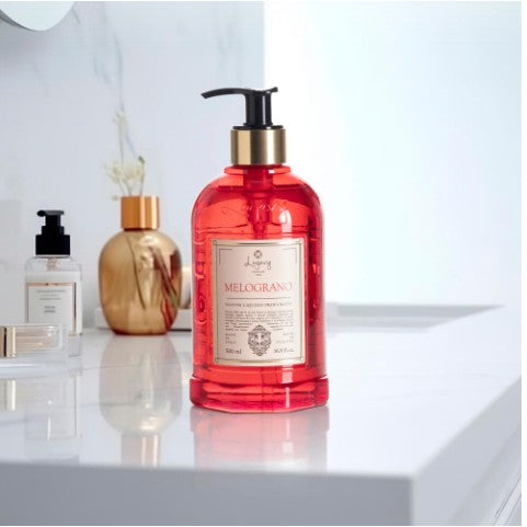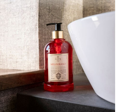 Scent - A luxurious fruity liquid soap with pomegranate notes, offering a gentle cleanse and leaving hands nourished and subtly perfumed. The Melograno fragrance features notes of pomegranate, red fruits, coconut, orange, and bergamot.