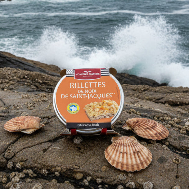Mouettes d'Arvor Scallop Rillettes are a creamy, savory French spread made from slow-cooked, shredded scallops and whitefish mixed with cream, butter, carrots, onion, and garlic for a rich, delicate flavor and texture.