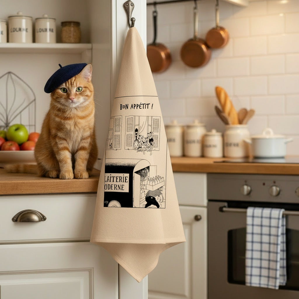 How curious these Dubout cats are! For this new collection, they continue to amuse us, perched dangerously at the window of their house to spy on a delightful delivery from the milk man. They adorn this 100% cotton, made in France tea towel, both durable and practical.