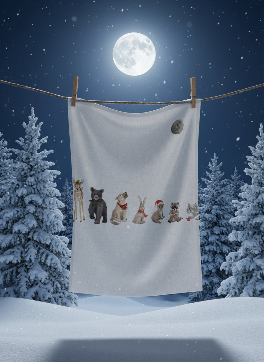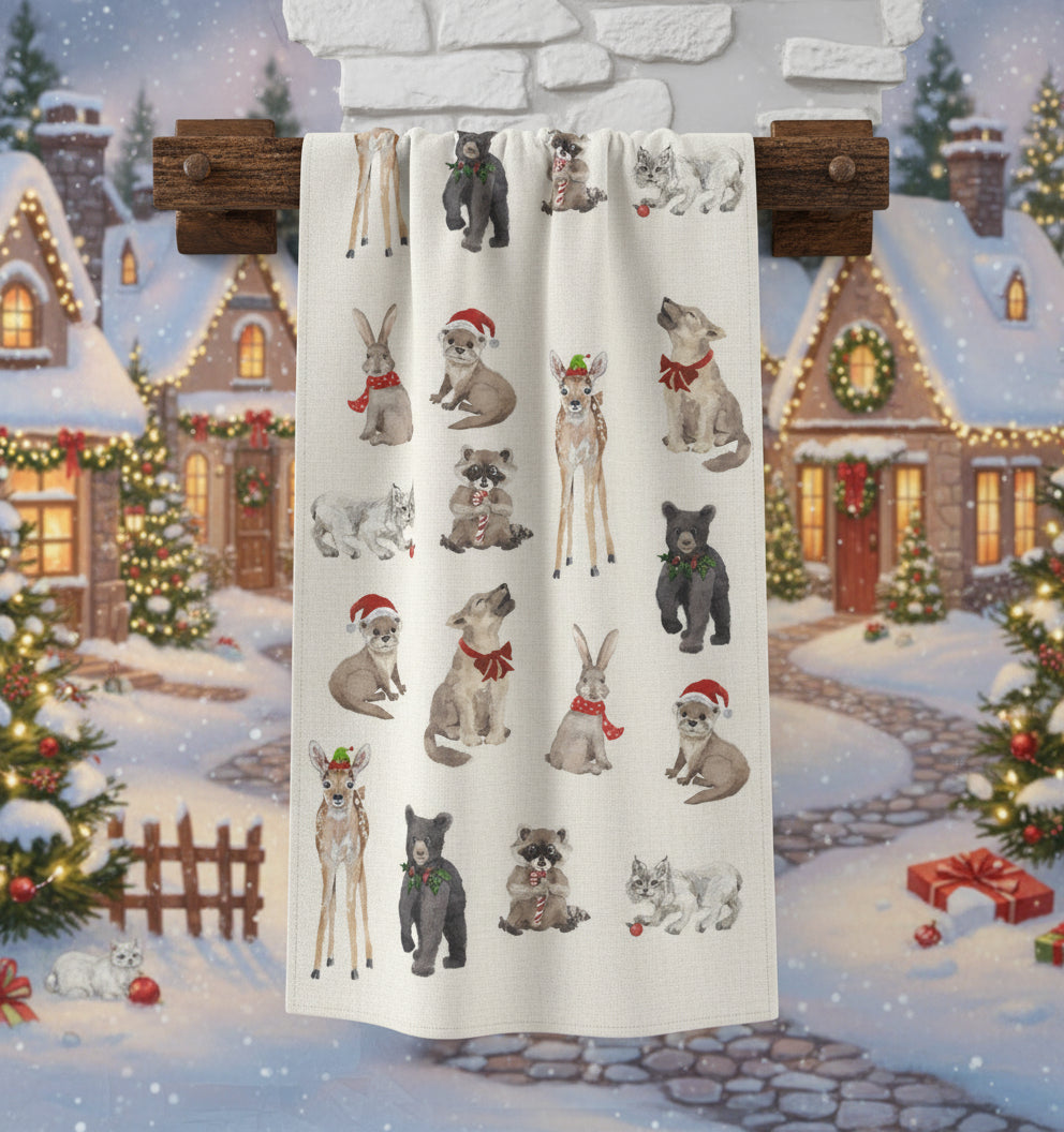 Bring holiday cheer to your kitchen with this Maison Lorrain "Baby Animals At Christmas " French Kitchen Tea Towel. Adorned with cute baby animals dressed in festive hats and scarves, this towel adds a fun and cozy vibe to your space.