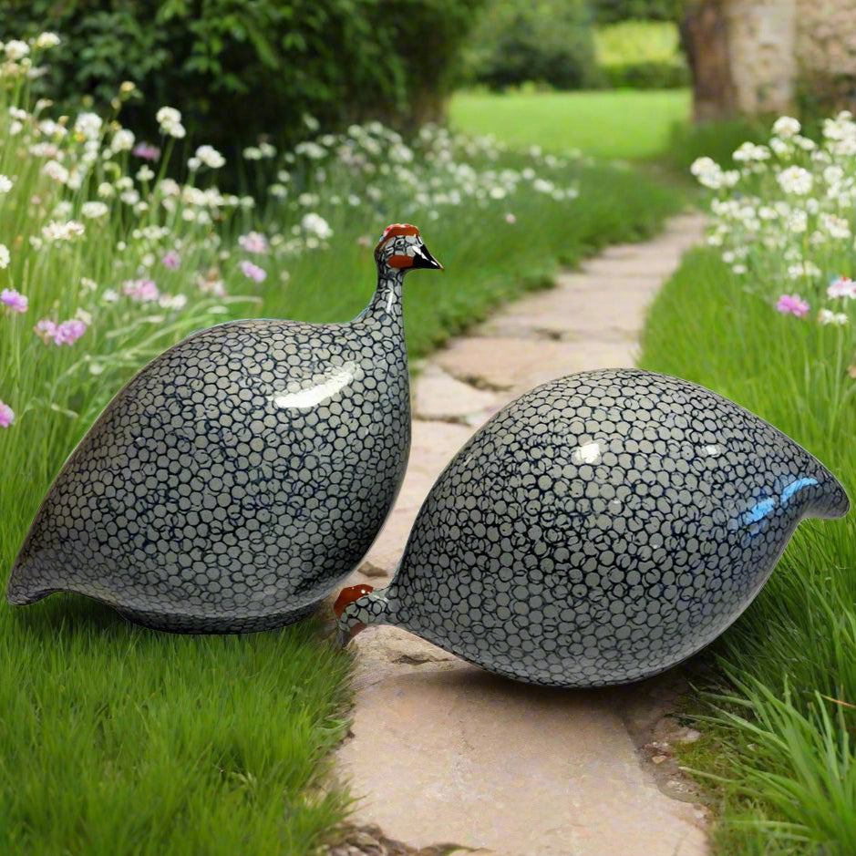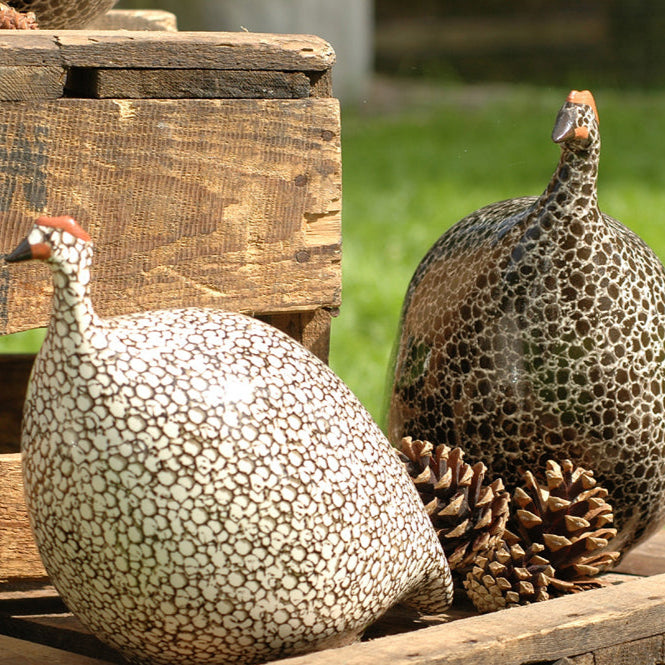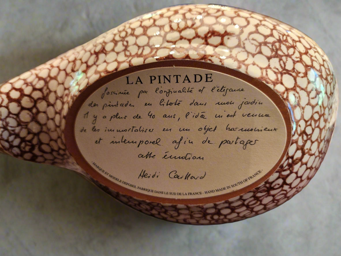 Crafted from clay and finished with a delicate hand-applied glaze, these exceptional pieces come from the charming town of Lussan in southern France. Here, in a small French artisan studio, each serene ceramic "pintade," or guinea fowl, is meticulously handcrafted, hand-painted and glazed.