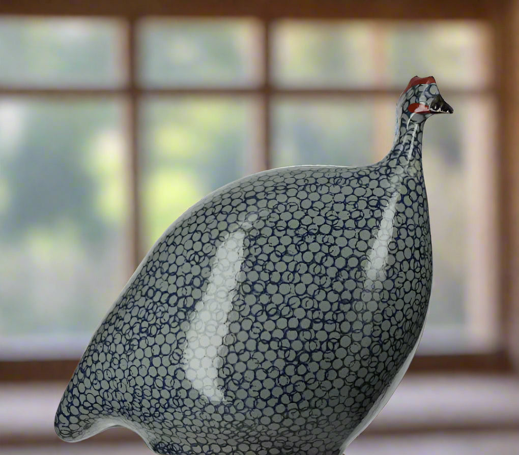 Les Céramiques de Lussan, La Pintade, French Ceramic Medium Guinea Fowl, Dove Blue with Speckled Cobalt, Head Up