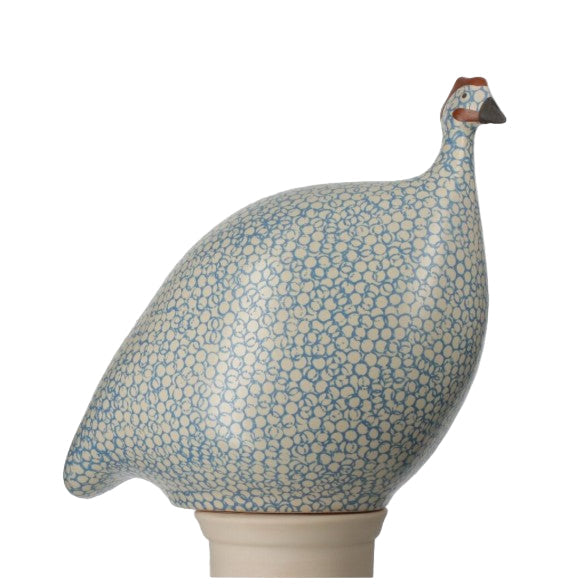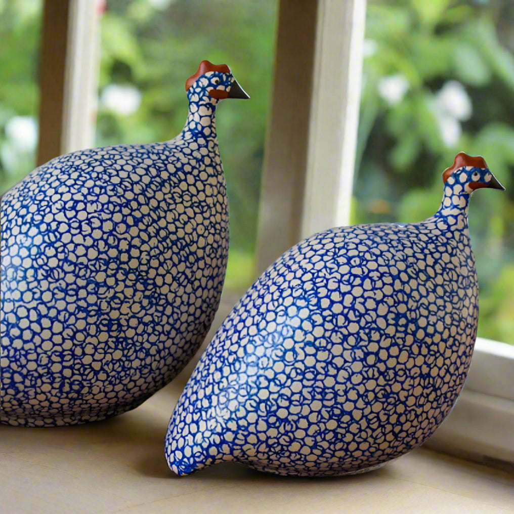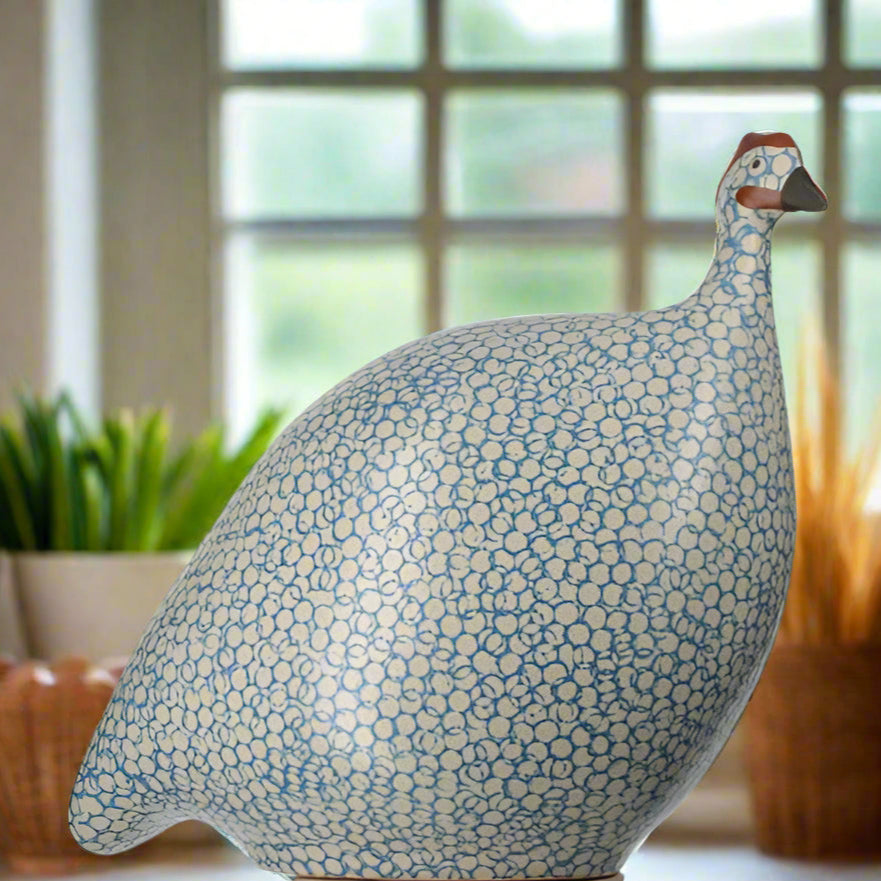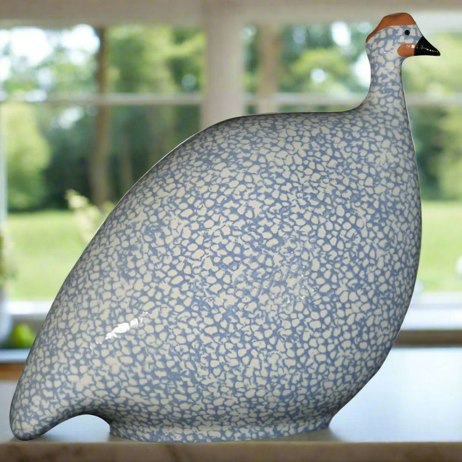 These quaint, serene guinea fowl or "pintades" are fabricated from clay and hand glazed. This grand size measures approximately 9" from head to tail, and stands approximately 9.5" tall.