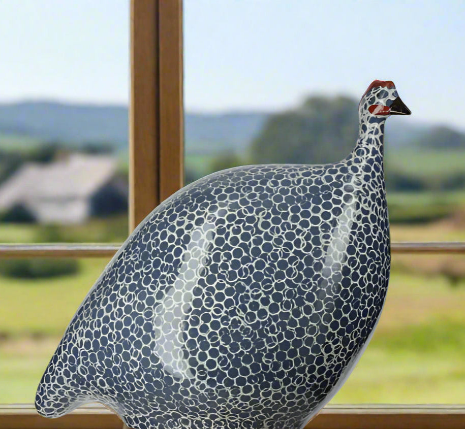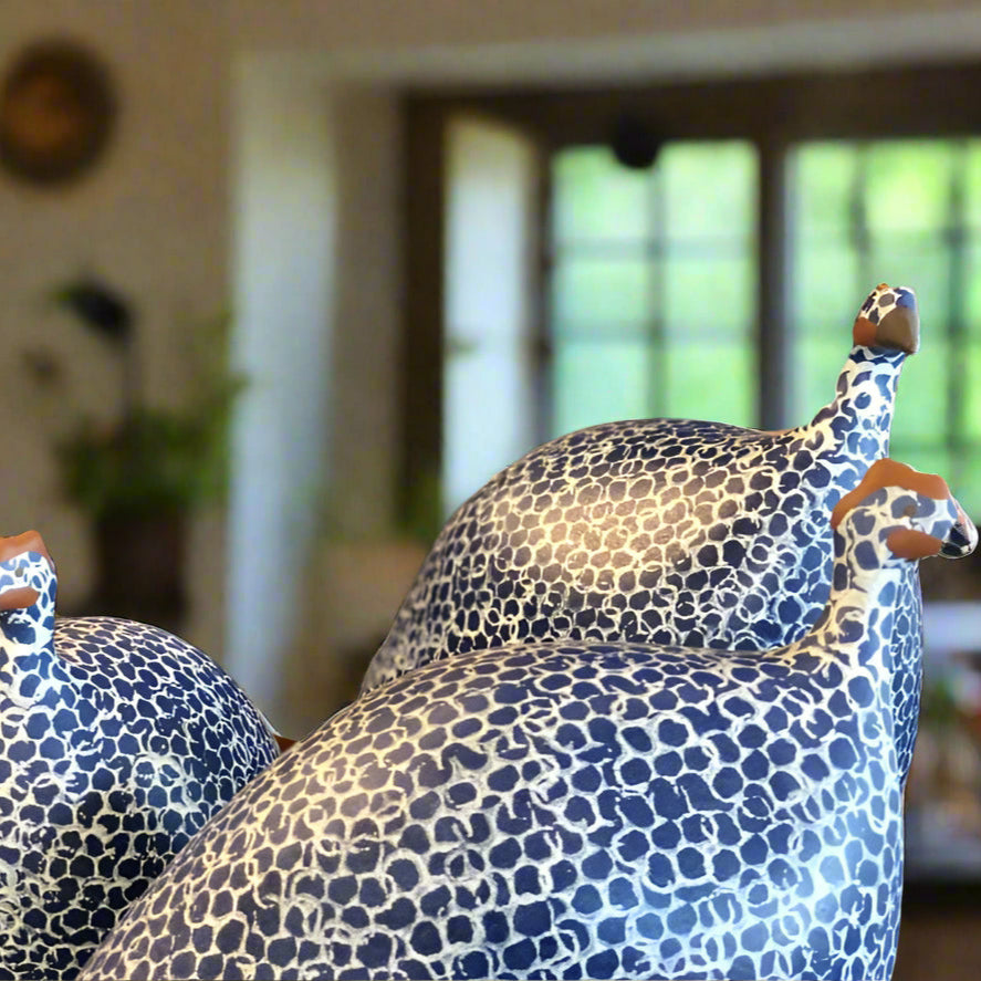 Crafted from clay and finished with a delicate hand-applied glaze, these exceptional pieces come from the charming town of Lussan in southern France. Here, in a small French artisan studio, each serene ceramic "pintade," or guinea fowl, is meticulously handcrafted, hand-painted and glazed.