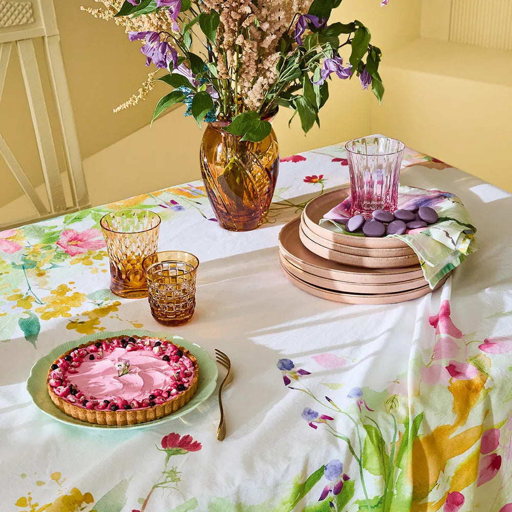This design was crafted from original artwork, hand-drawn by a Garnier-Thiebaut in-house team of textile artisans and designers in France. Combining the best qualities of cotton and linen, this fabric blend seamlessly enhances the table with its effortless appearance while providing durability and long-lasting performance.