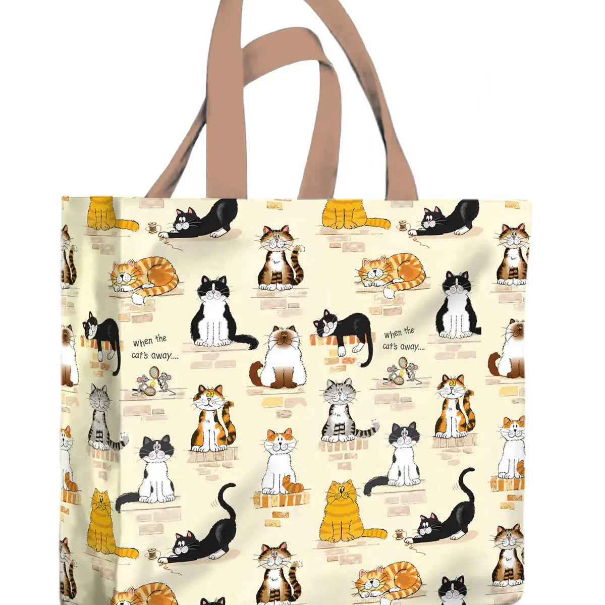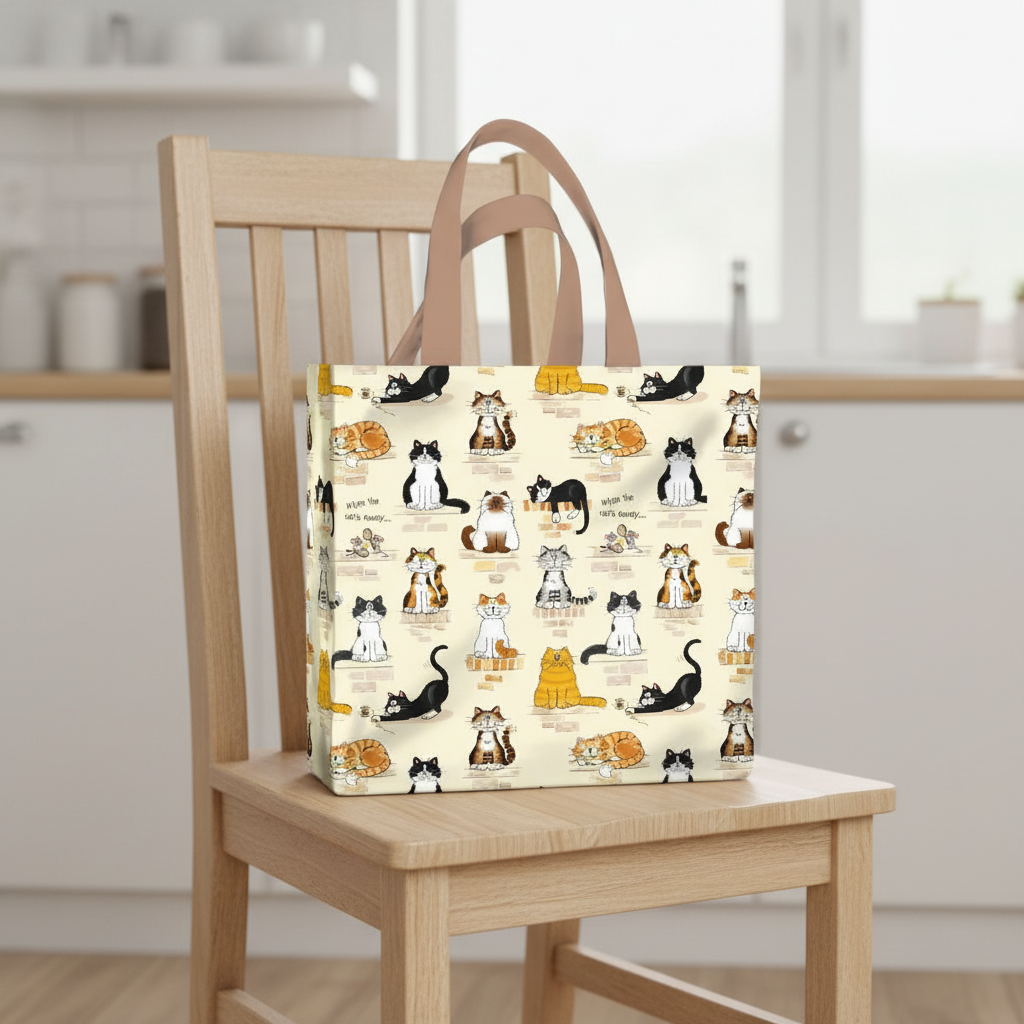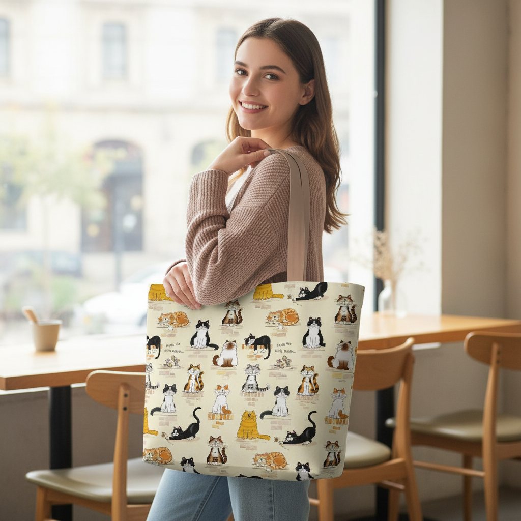 You can carry your items in style with this handy canvas tote displaying multiple whimsical cats.