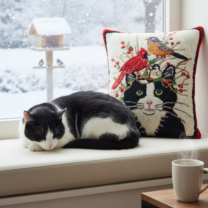 Celebrate the season with this wool-hooked throw pillow by Mary Lake Thompson, showcasing a delightful winter scene of a cat and birds.