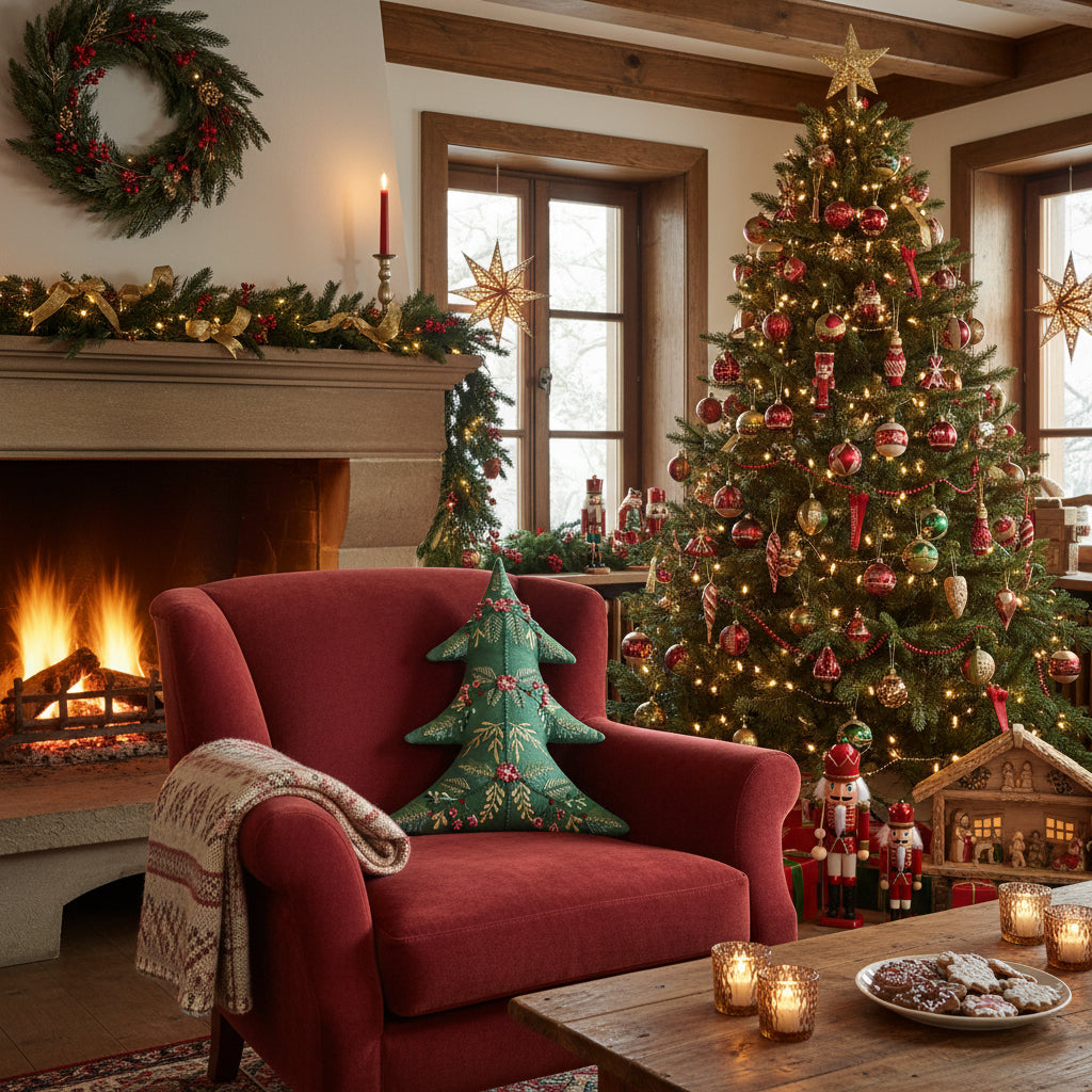 Add to your holiday décor with this European embroidered Christmas Tree-Shaped pillow, a sophisticated accent piece that brings timeless seasonal elegance to any room.