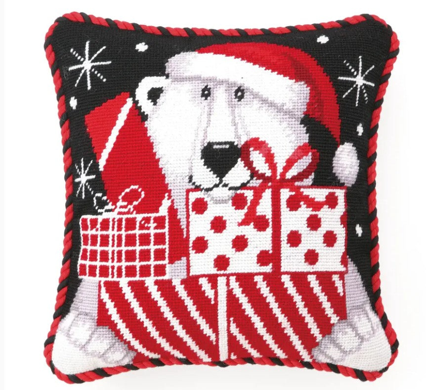Just in time for the holidays! Handcrafted 100% wool needlepoint accent pillow of a polar bear "bearing" gifts.