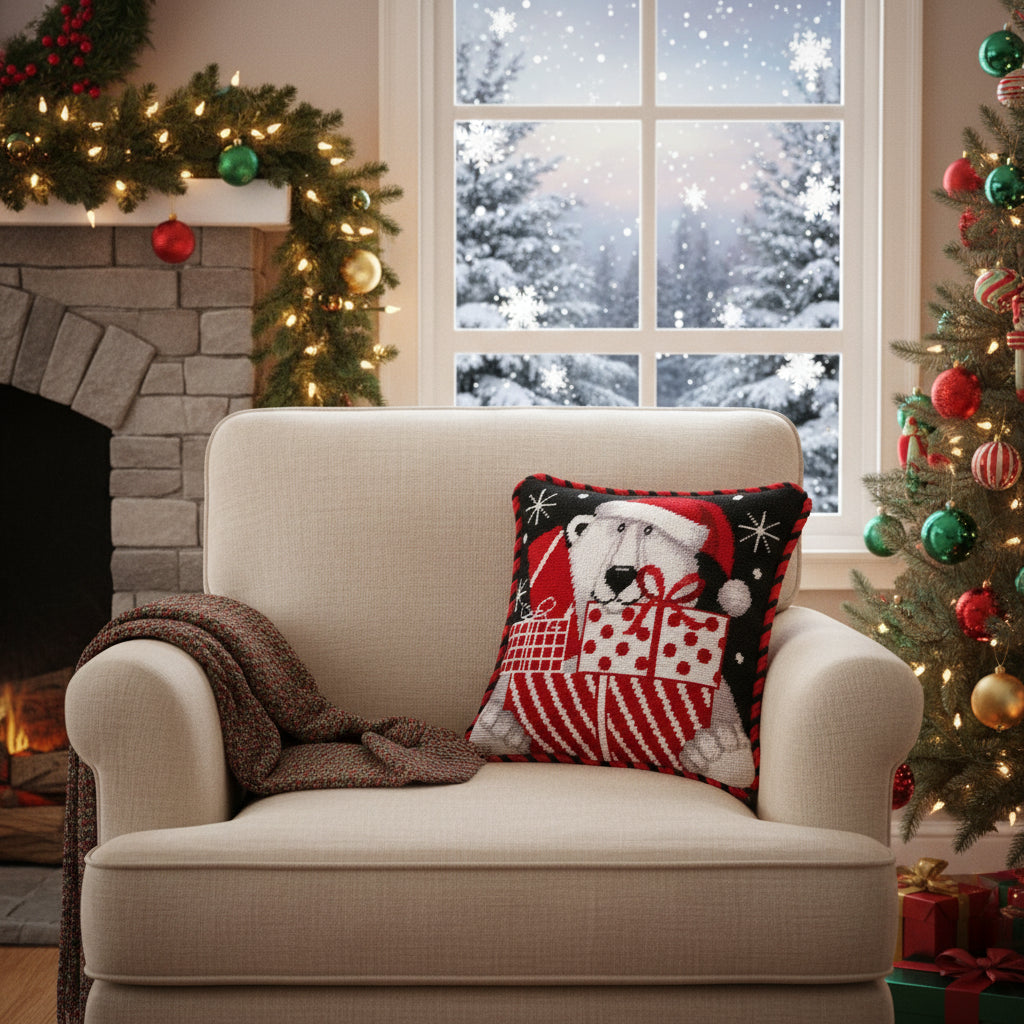 European "Polar Bear Bearing Presents Christmas" Needlepoint Accent Pillow with Insert, 12" x 12"