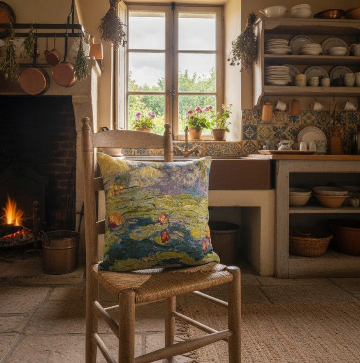 Monet's Les Nymphéas (Water Lilies) is a series of approximately 250 oil paintings by Monet that depict his water lily pond at his home in Giverny. The series focuses on Monet's water garden, particularly the surface of the pond, water lilies, and the reflections of the sky and surrounding vegetation. Monet created these works during the last 31 years of his life, often without a horizon line, which creates a sense of flatness and abstraction that moves beyond traditional landscape painting. This woven pillow captures one panel of these paintings.