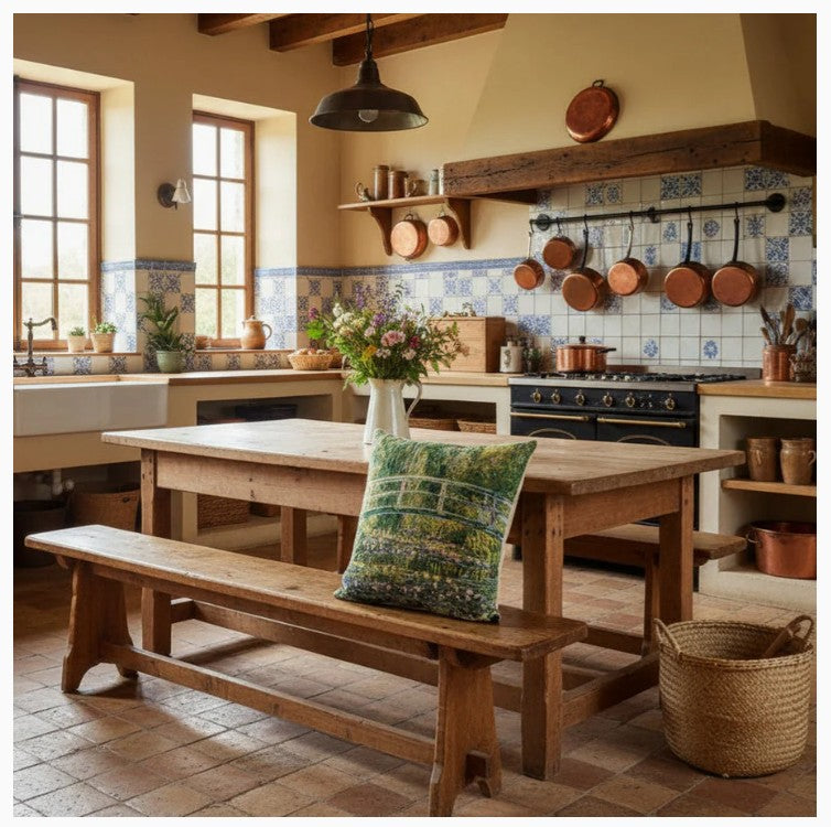 Monet’s renowned “Pont de Giverny” series portrays a delicate Japanese-style wooden bridge spanning a lily-filled pond in his garden. These works emphasize the delicate play of light, color, and reflection, rendered in the fluid, expressive strokes of Impressionism. Central elements include the graceful arch of the bridge, the draping weeping willows, and the glistening water surface, evoking a serene and fleeting natural beauty. This woven tapestry pillow cover artfully embodies the spirit and ambiance of Monet’s iconic scene.