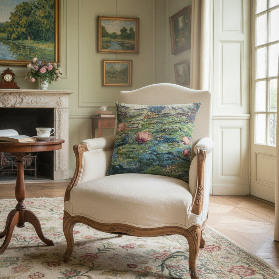 Monet's Les Nymphéas (Water Lilies) is a series of approximately 250 oil paintings by Monet that depict his water lily pond at his home in Giverny. The series focuses on Monet's water garden, particularly the surface of the pond, water lilies, and the reflections of the sky and surrounding vegetation. Monet created these works during the last 31 years of his life, often without a horizon line, which creates a sense of flatness and abstraction that moves beyond traditional landscape painting. This woven pillow captures one panel of these paintings.