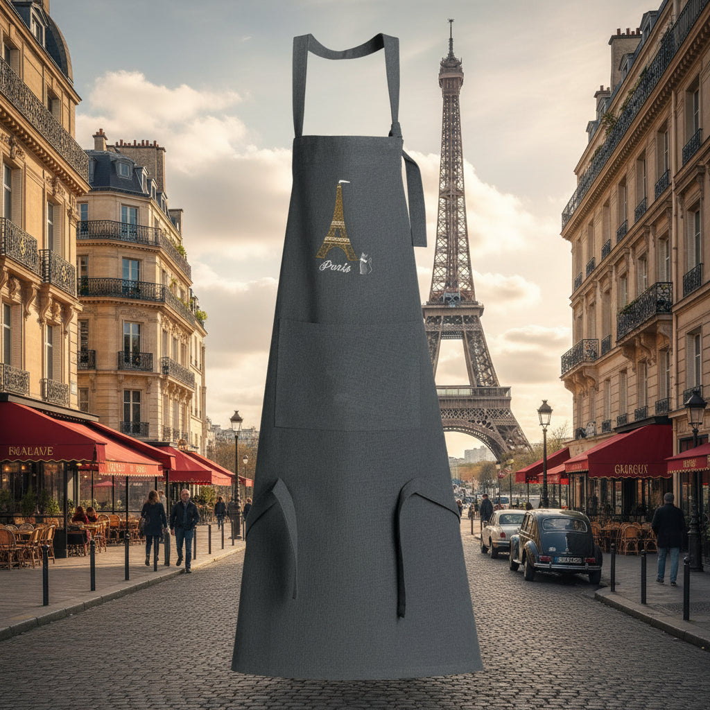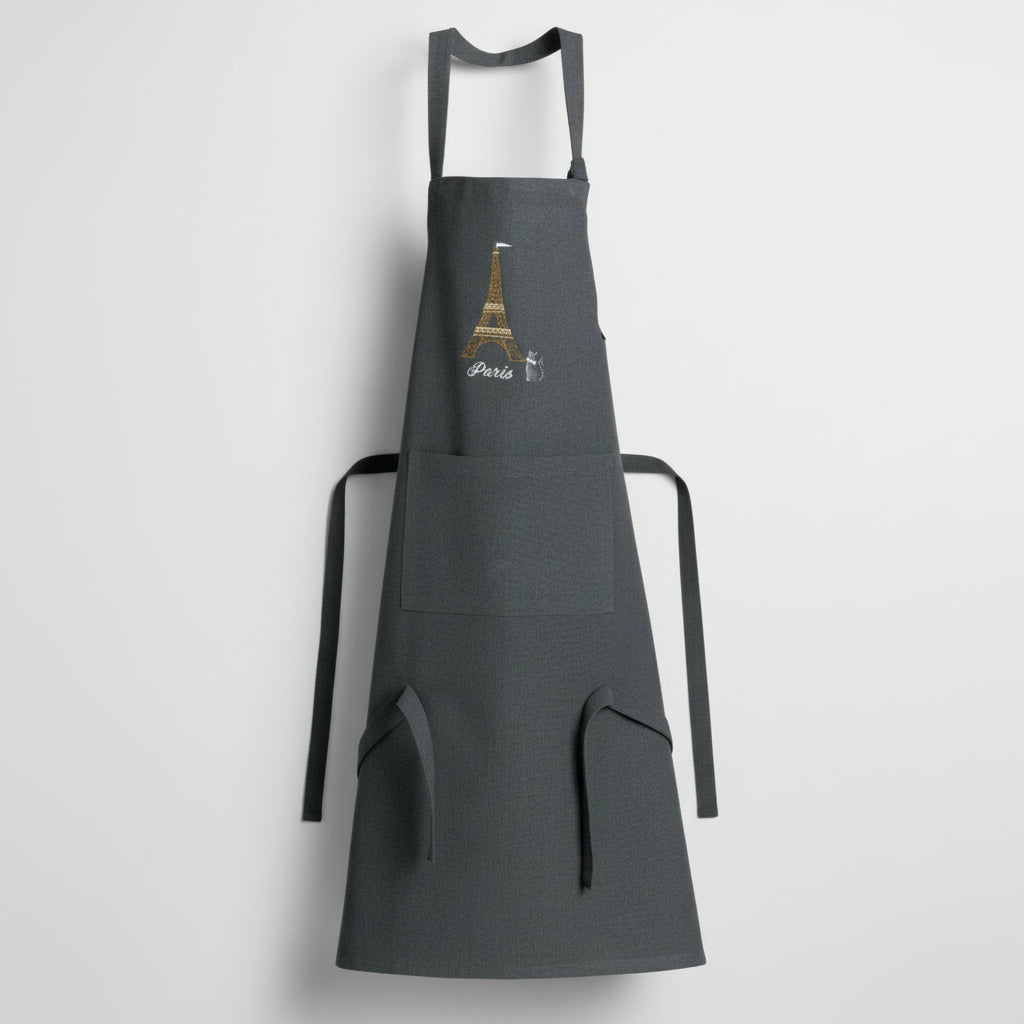 Transform your kitchen routine with this charming gray apron featuring the timeless Paris / Eiffel Tower design with a small cat. Crafted from a sustainable blend of 80% recycled cotton and 20% polyester, it brings authentic Parisian elegance to your culinary space. The spacious front pocket keeps your essentials within reach, while the full coverage design protects your clothes in style.
