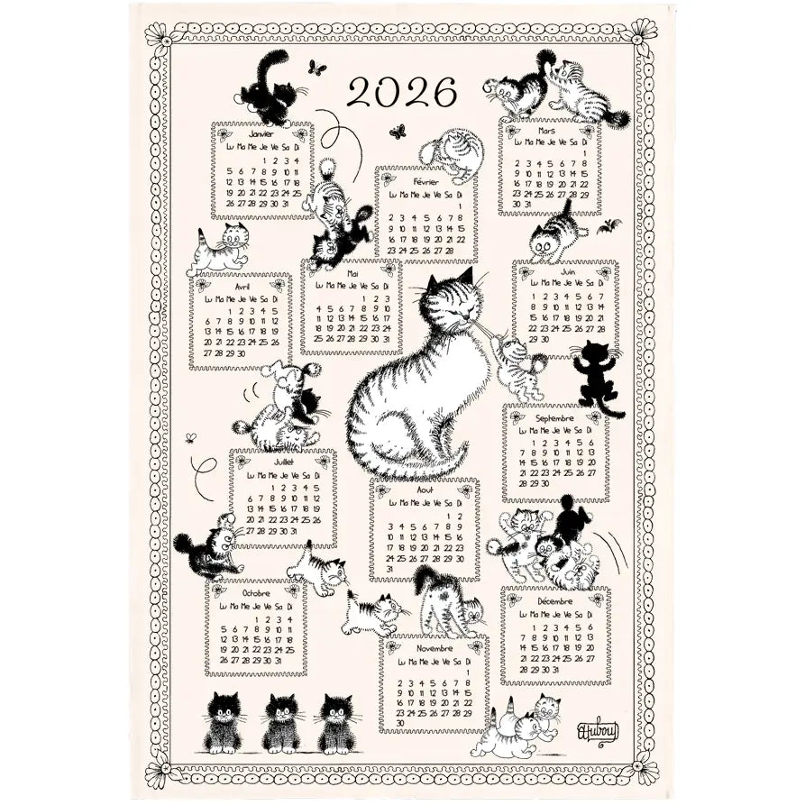 Cats, cats and more cats! The Dubout felines will follow you all year 2026 on this large calendar towel.  Part of Torchons & Bouchons Dubout Collection - all drawn by famous French cartoonist and illustrator, Albert Dubout (1906-1976).
