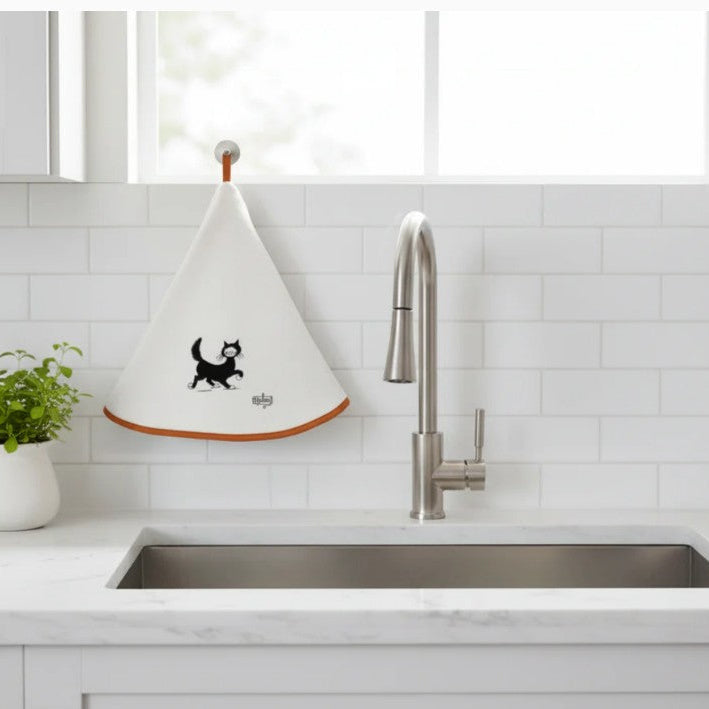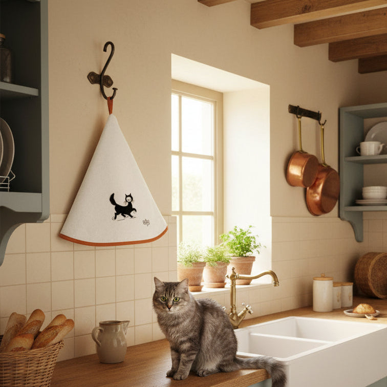 Torchons & Bouchons, Dubout, Chat Balade Round Cream Hand Towel with Hanging Loop