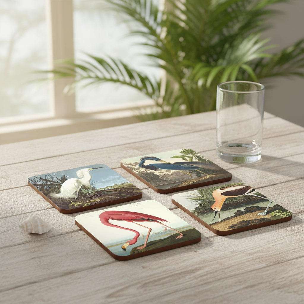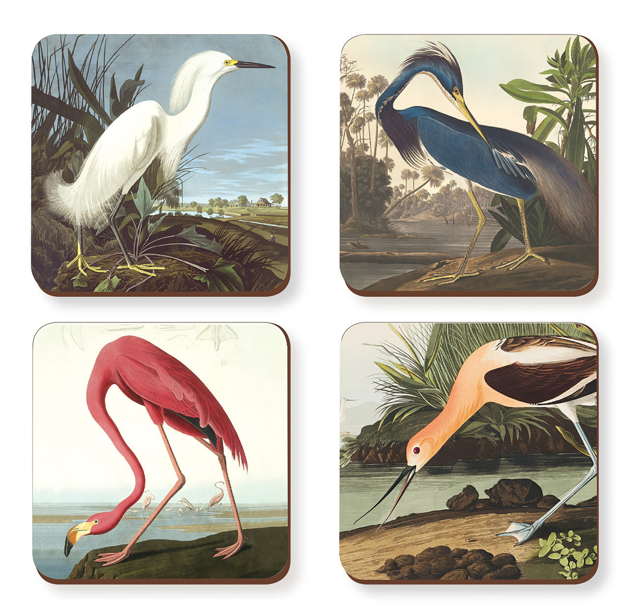 Four beautiful images of water birds from John James Audubon's Birds of America are featured in this handsome coaster set.