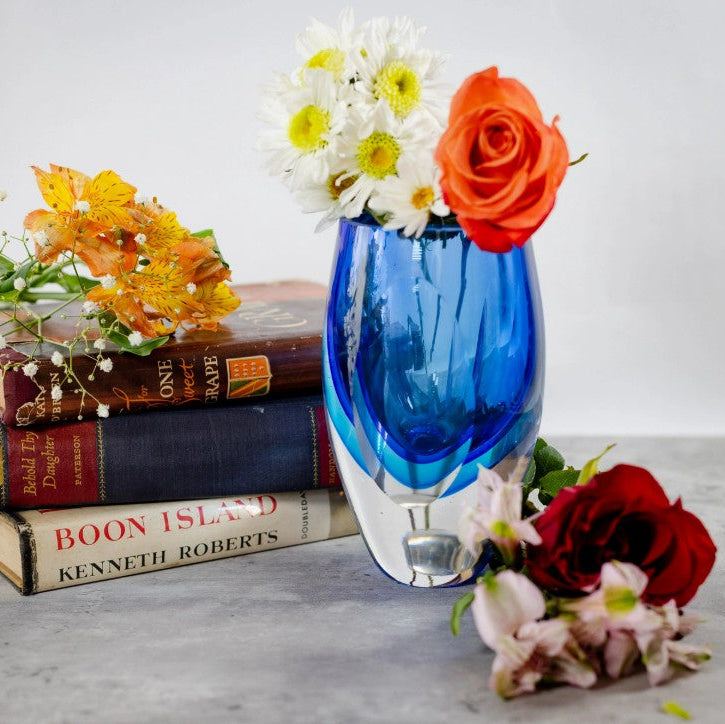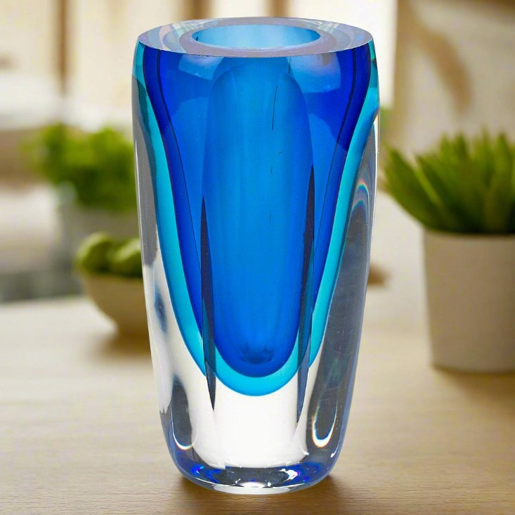This exquisite 6-inch Azure crystal vase showcases beautiful layered blue shades that evoke the shimmer of sunlit water. Its clear crystal base offers a bold contrast as the vibrant colors spill gracefully over the rim. Crafted from thick, heavy mouth-blown glass, this vase adds an elegant and luxurious touch to any space.