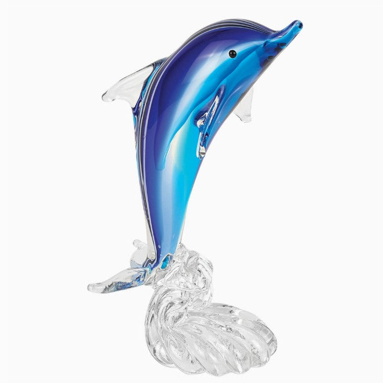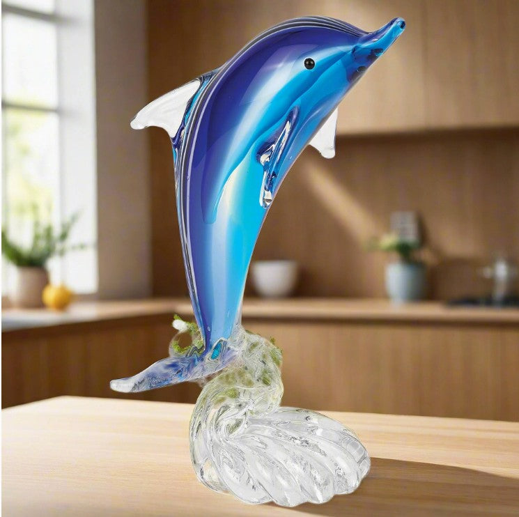 Badash Décor, "Blue Dolphin On Clear Wave" Glass Sculpture, Murano-Style Figurine, 9" Tall