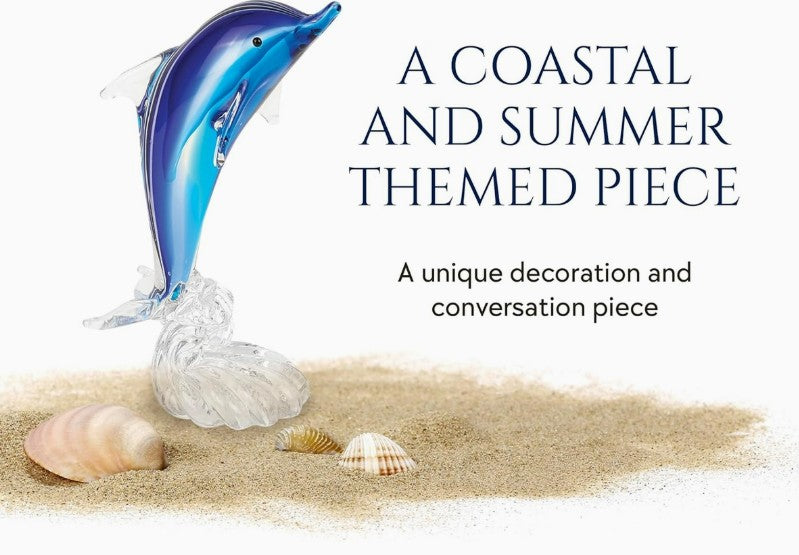 Discover the refined allure of this 9-inch Badash crystal sculpture, where a graceful dolphin emerges from a wave in pristine clear and ocean blue glass. The piece commands attention as a sophisticated focal point while maintaining the serene, contemplative quality of marine-inspired design.