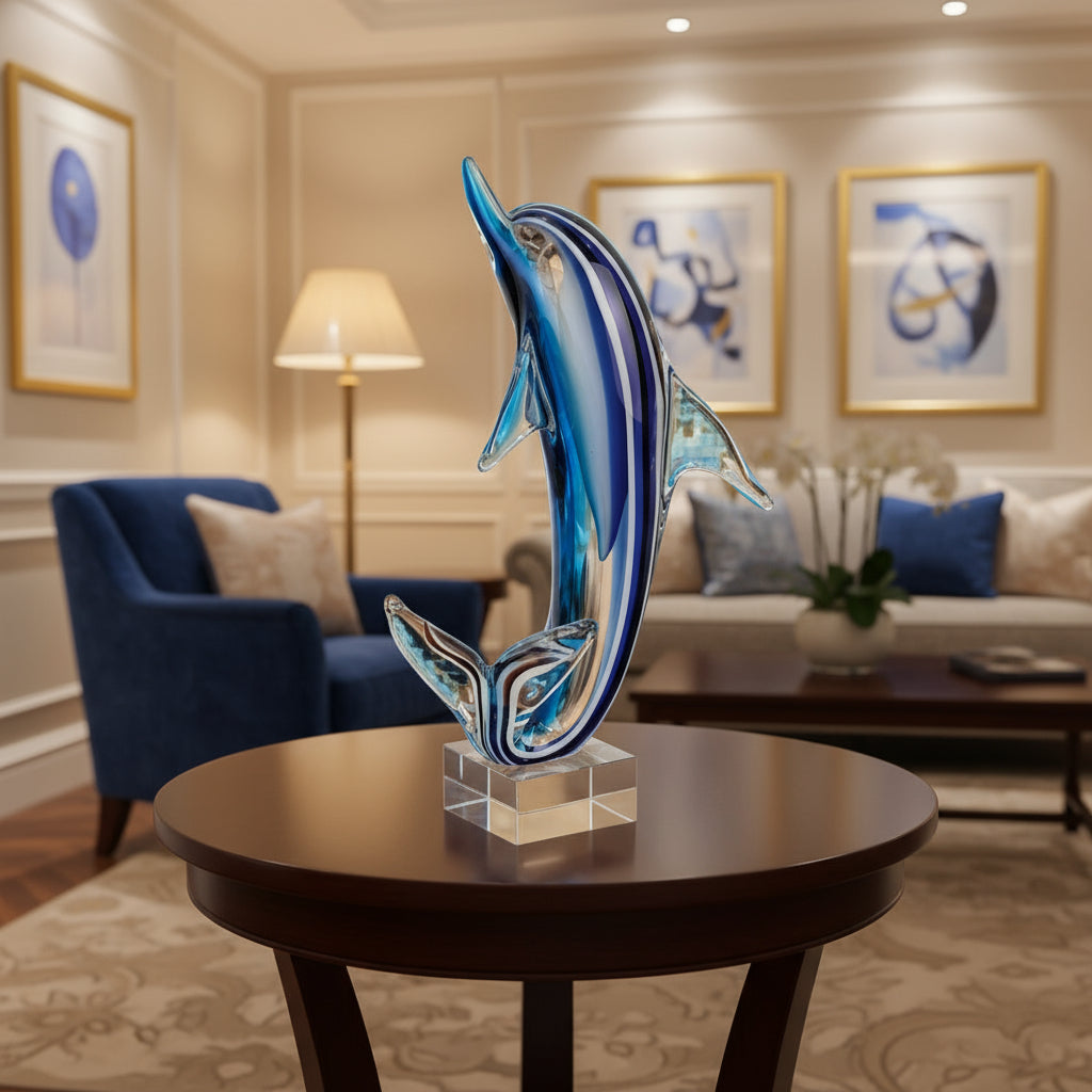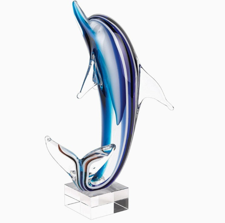 This sophisticated 14-inch tall crystal sculpture captures a large dolphin gracefully in motion, rendered in exquisite clear and sea blue hues. Set on a sleek clear square base, this Murano-style piece highlights fine craftsmanship and elegance, making it a striking centerpiece for any refined decor. Ideal for collectors or those seeking a serene marine-inspired accent, it blends artistry with timeless beauty.