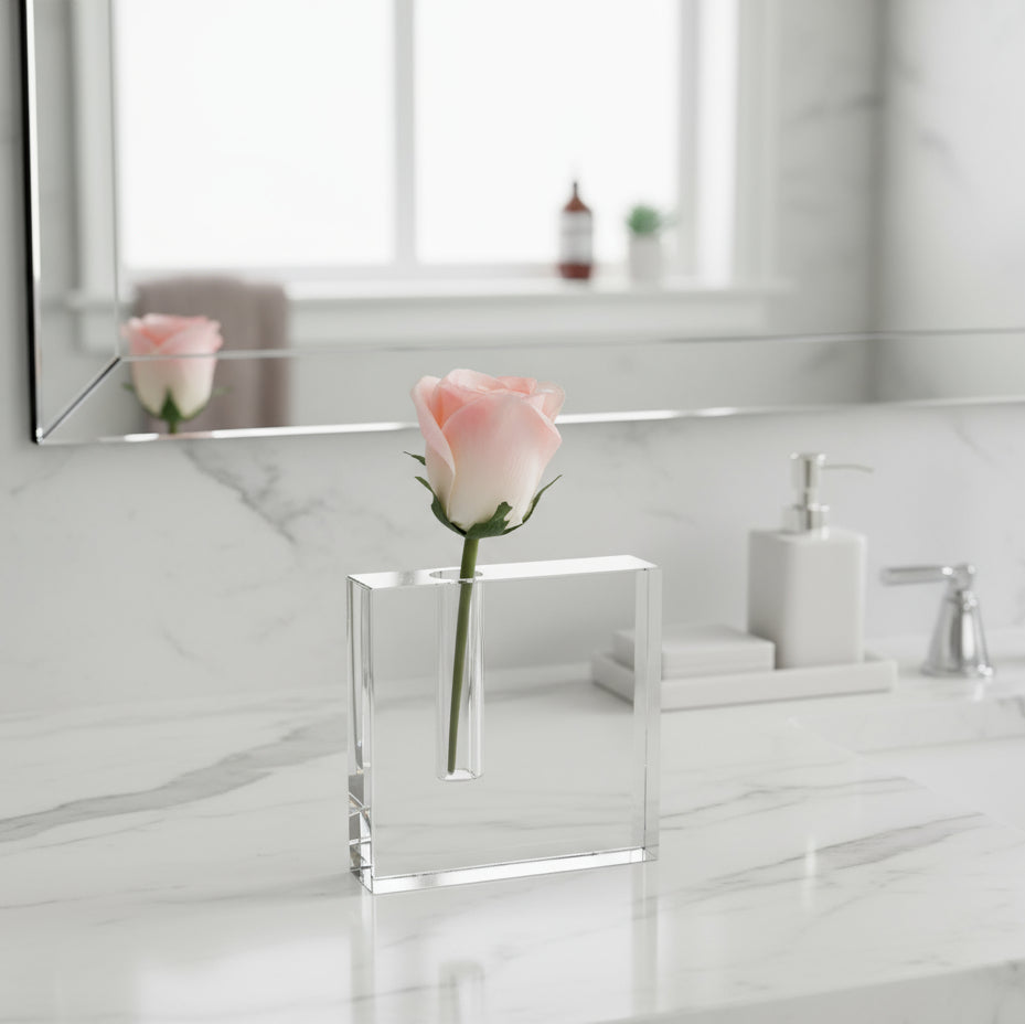 This sleek 6 x 6 inch handcrafted crystal bud vase exemplifies modern elegance. Its clear block design offers versatility, making it an ideal gift for any occasion or holiday celebration. With its refined simplicity, it adds a sophisticated touch to any setting, perfect for showcasing a single bloom or several small stems in a room or powder room.